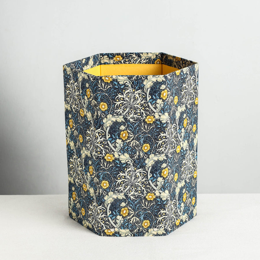 This waste paper bin is not only functional but also a stylish and eco-friendly way to dispose of your trash. Made from recycled card board and screen printed cotton fabric, this waste paper bin is a sustainable choice for your waste disposal needs. The hexagonal shape with six sides gives it a unique look that stands out from traditional round bins. The fabric embellishment with a floral print adds a touch of elegance to your space. The collapsible design allows you to store it away easily when not in use, saving you space.