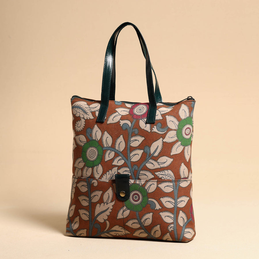 Material Brown handcrafted kalamkari printed cotton hand bag with leather handle made by the master artisans of Kolkata, West Bengal. Crafted with utmost care, the vegetable-tanned, hand-painted leather handles adds a touch of luxury. This bag features two exterior pockets, an interior zipper pocket, and ample space for essentials, making it a perfect blend of fashion and functionality.