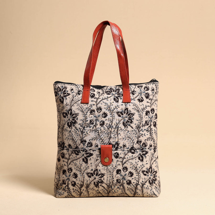 Beige handcrafted kalamkari block printed cotton hand bag with leather handle made by the master artisans of Kolkata, West Bengal. Crafted with utmost care, the vegetable-tanned, hand-painted leather handles adds a touch of luxury. This bag features two exterior pockets, an interior zipper pocket, and ample space for essentials, making it a perfect blend of fashion and functionality.