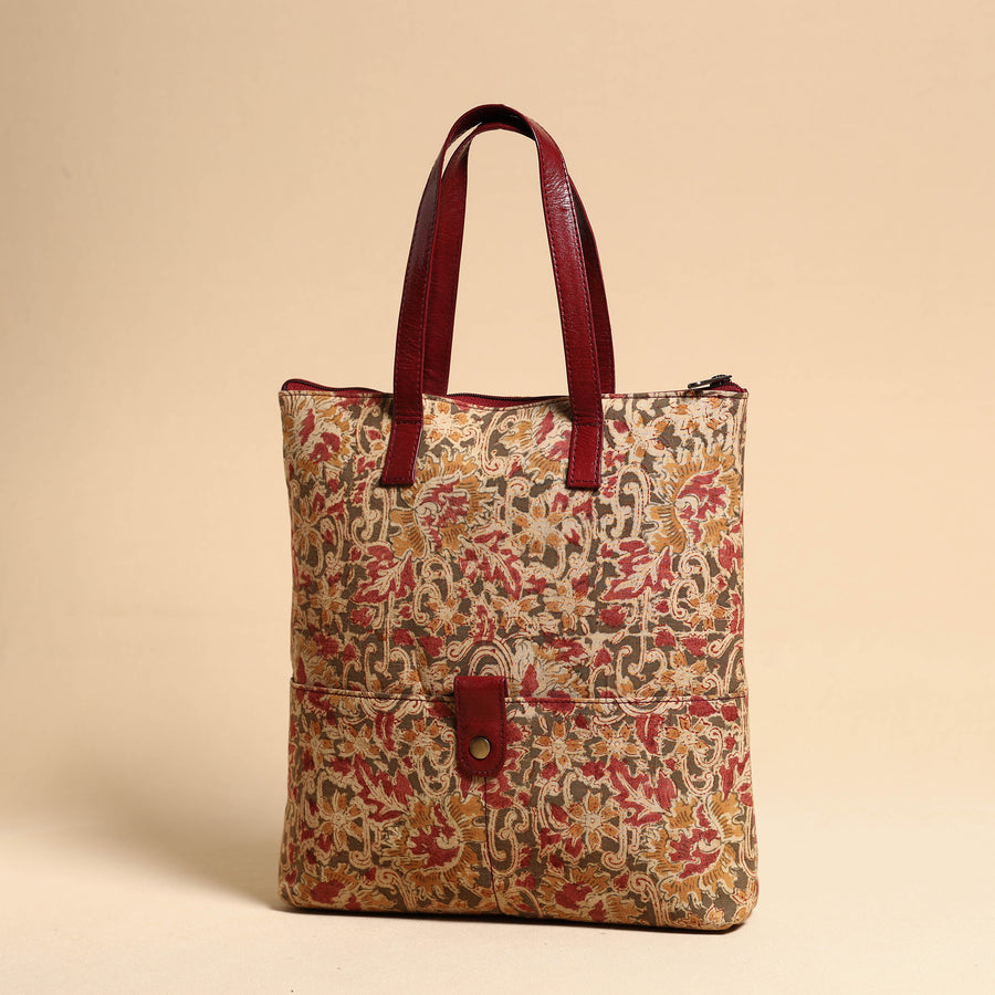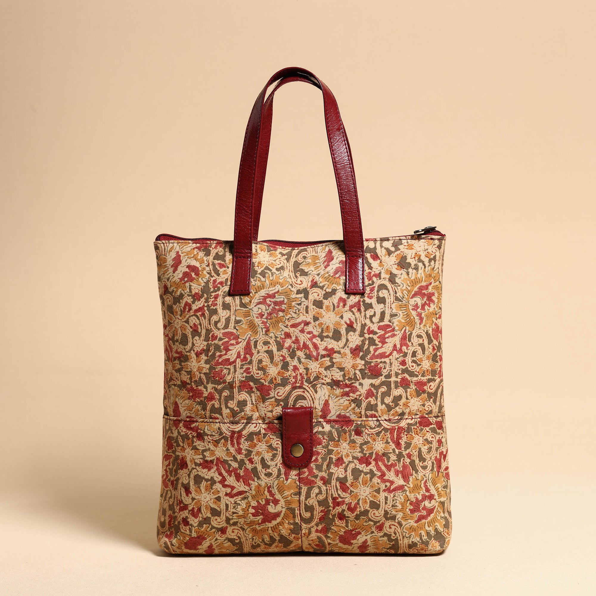 Multicolor handcrafted kalamkari block printed cotton hand bag with leather handle made by the master artisans of Kolkata, West Bengal. Crafted with utmost care, the vegetable-tanned, hand-painted leather handles adds a touch of luxury. This bag features two exterior pockets, an interior zipper pocket, and ample space for essentials, making it a perfect blend of fashion and functionality.