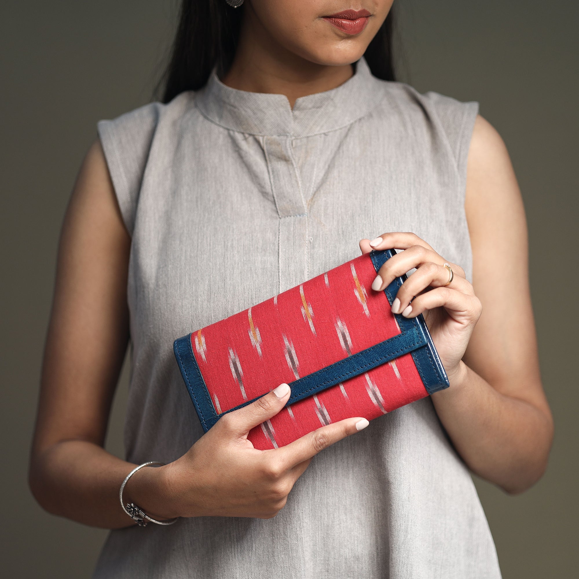 This uniquely designed, handcrafted red ikat weave cotton fabric cover leather wallet made by the master artisans of Kolkata, West Bengal. Crafted utmost care with the vegetable-tanned, hand-painted leather, ensuring both durability and elegance. It offers six card slots for organization and two secure zipper pockets for convenience. With two cash compartments, it's the perfect blend of fine quality and functionality, ensuring you stay stylishly organized.