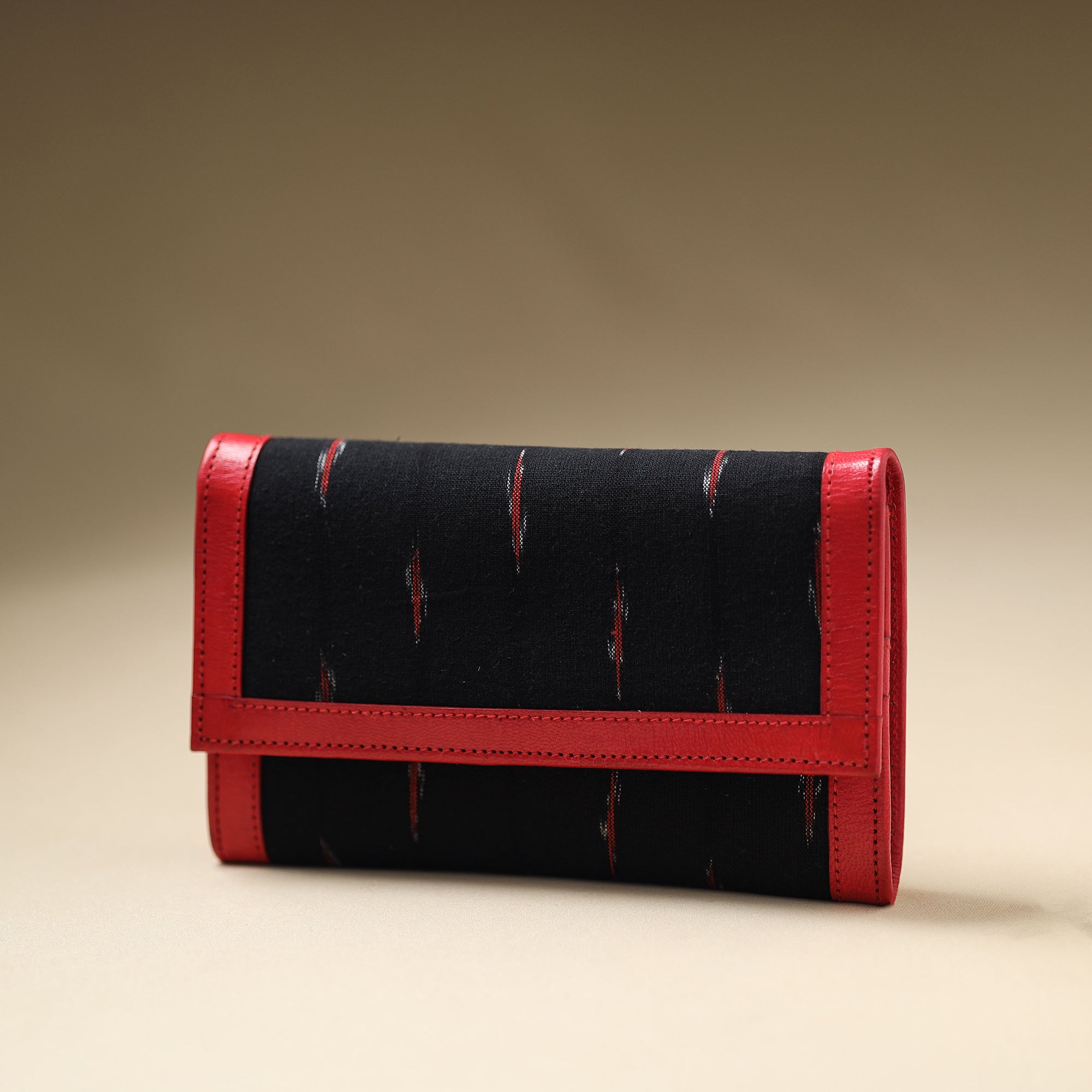 This uniquely designed, handcrafted black ikat weave cotton fabric cover leather wallet made by the master artisans of Kolkata, West Bengal. Crafted utmost care with the vegetable-tanned, hand-painted leather, ensuring both durability and elegance. It offers six card slots for organization and two secure zipper pockets for convenience. With two cash compartments, it's the perfect blend of fine quality and functionality, ensuring you stay stylishly organized.