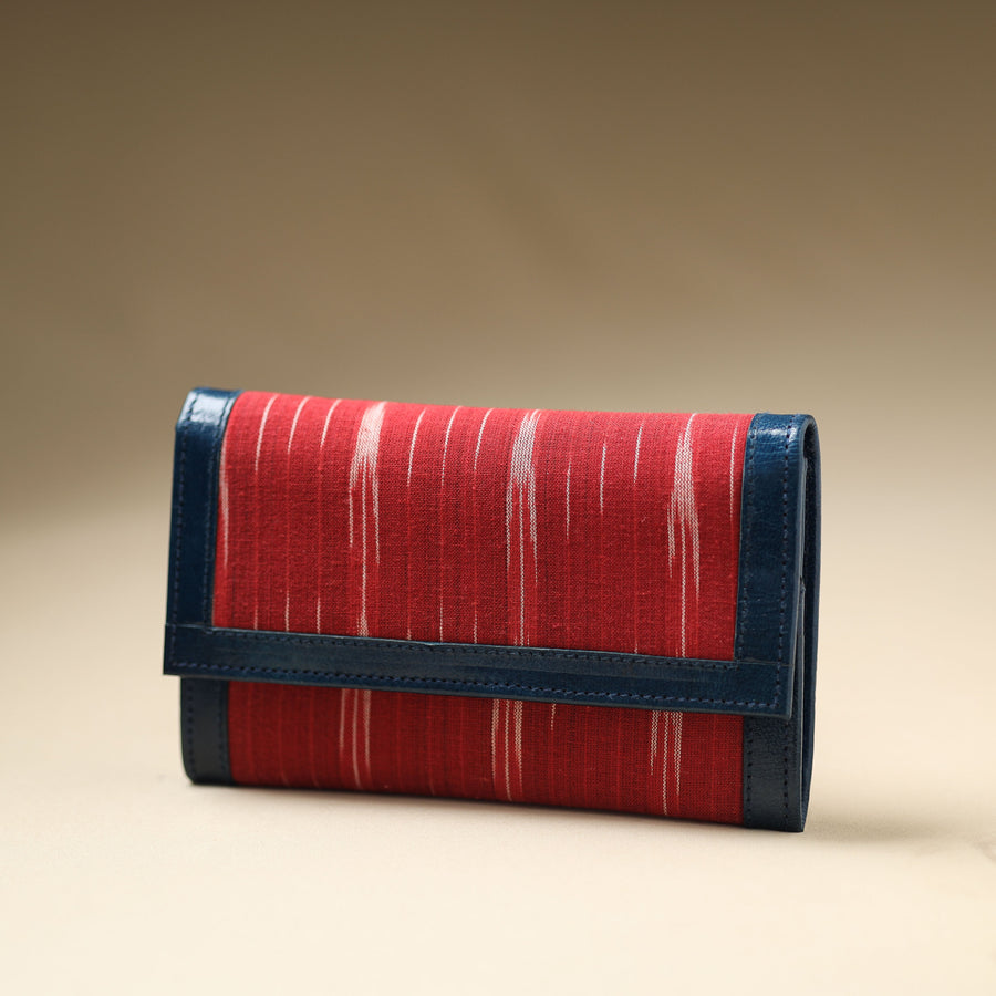 This uniquely designed, handcrafted red ikat weave cotton fabric cover leather wallet made by the master artisans of Kolkata, West Bengal. Crafted utmost care with the vegetable-tanned, hand-painted leather, ensuring both durability and elegance. It offers six card slots for organization and two secure zipper pockets for convenience. With two cash compartments, it's the perfect blend of fine quality and functionality, ensuring you stay stylishly organized.