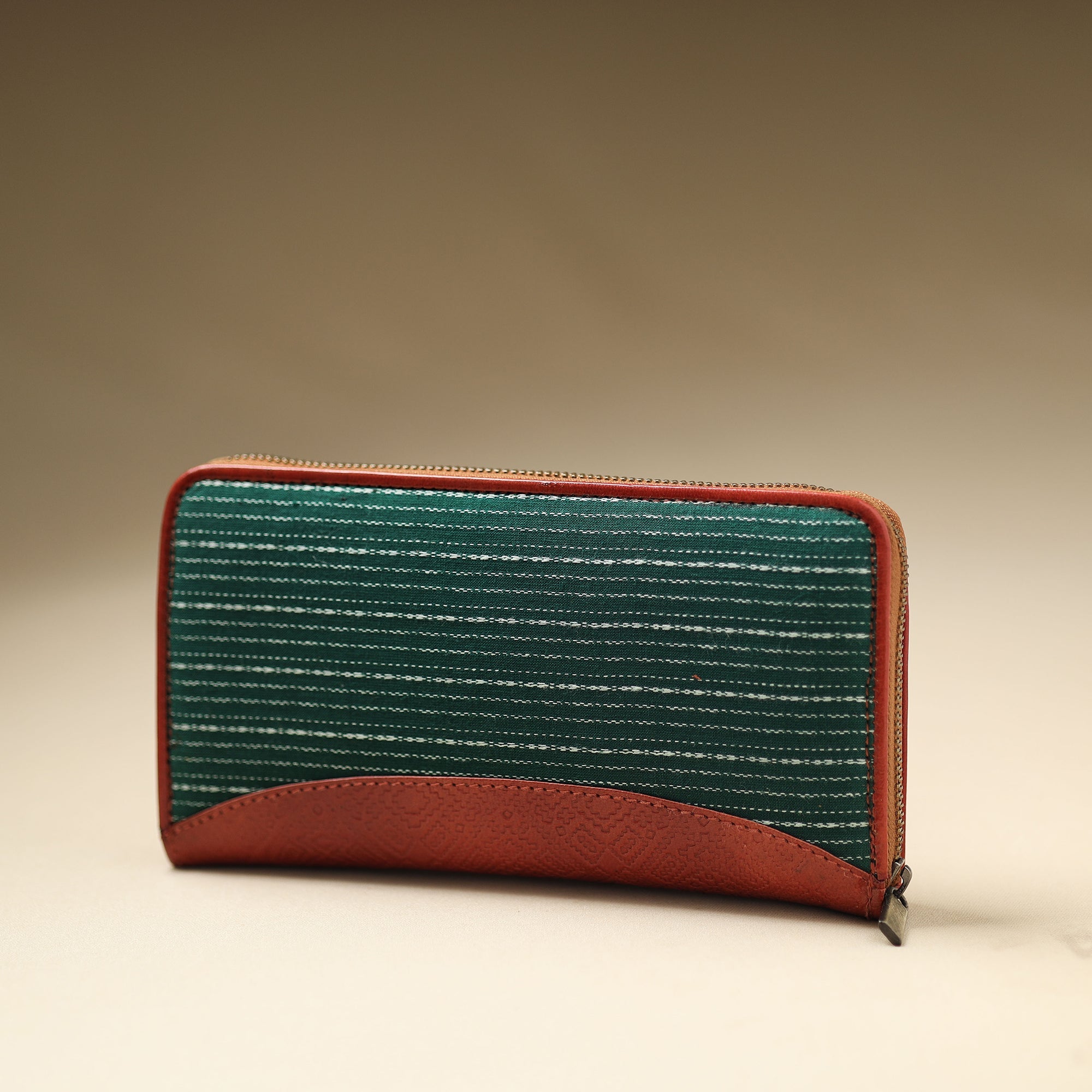 This uniquely designed, handcrafted green jacquard weave cotton fabric cover leather wallet made by the master artisans of Kolkata, West Bengal. Crafted utmost care with the vegetable-tanned, hand-painted leather, ensuring both durability and elegance. It offers five card slots for organization, a secure zipper pocket, and a snap-button pocket for convenience. With three cash compartments, it's the perfect blend of fine quality and functionality, ensuring you stay stylishly organized.