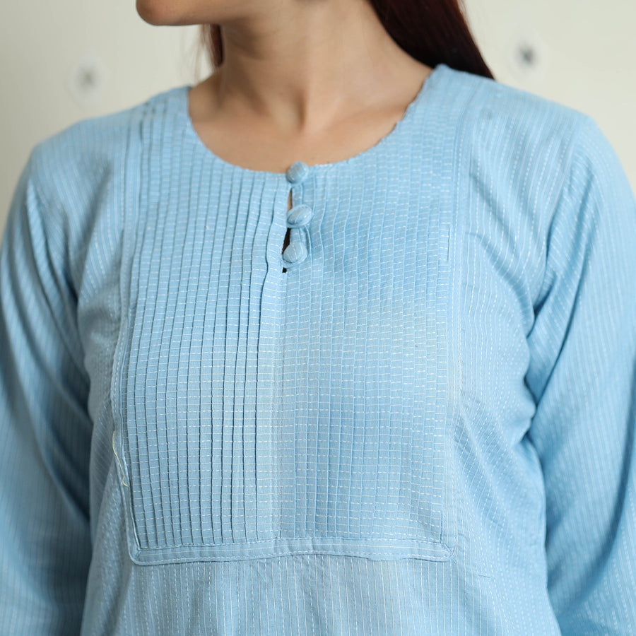 Look and feel beautiful in this uniquely designed plain running stitch cotton pintuck long kurta. This exquisite kurta is crafted from the fine quality plain running stitch cotton fabric, ensuring a comfortable feel against your skin. It boasts an exquisite running stitch and pintuck design, adding a touch of elegance to your ensemble. The kurta also features a convenient one-side pocket, perfect for carrying small essentials. It's an ideal choice for both casual and festive occasions.
