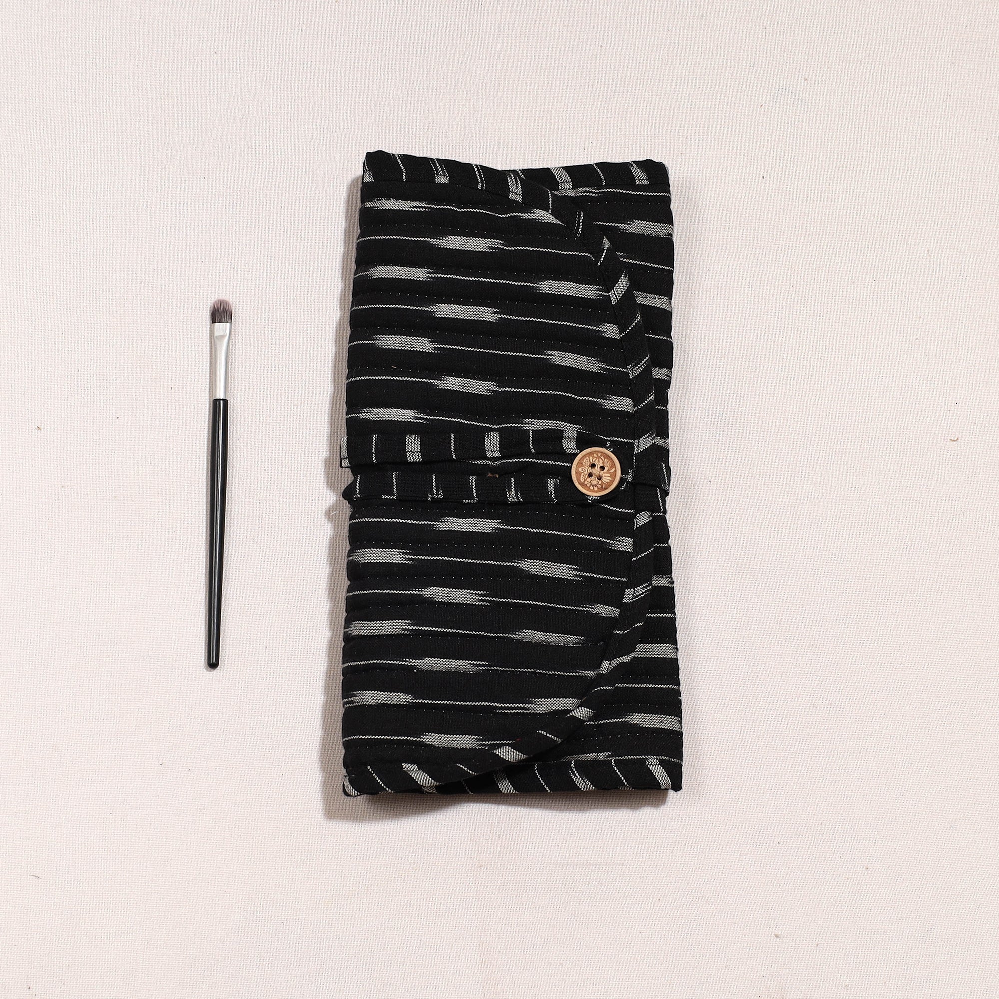 Material Handcrafted ikat cotton multipurpose segmented makeup brush wrap pouch/storage organizer with multiple compartments for convenient and stylish organization of your beauty tools.