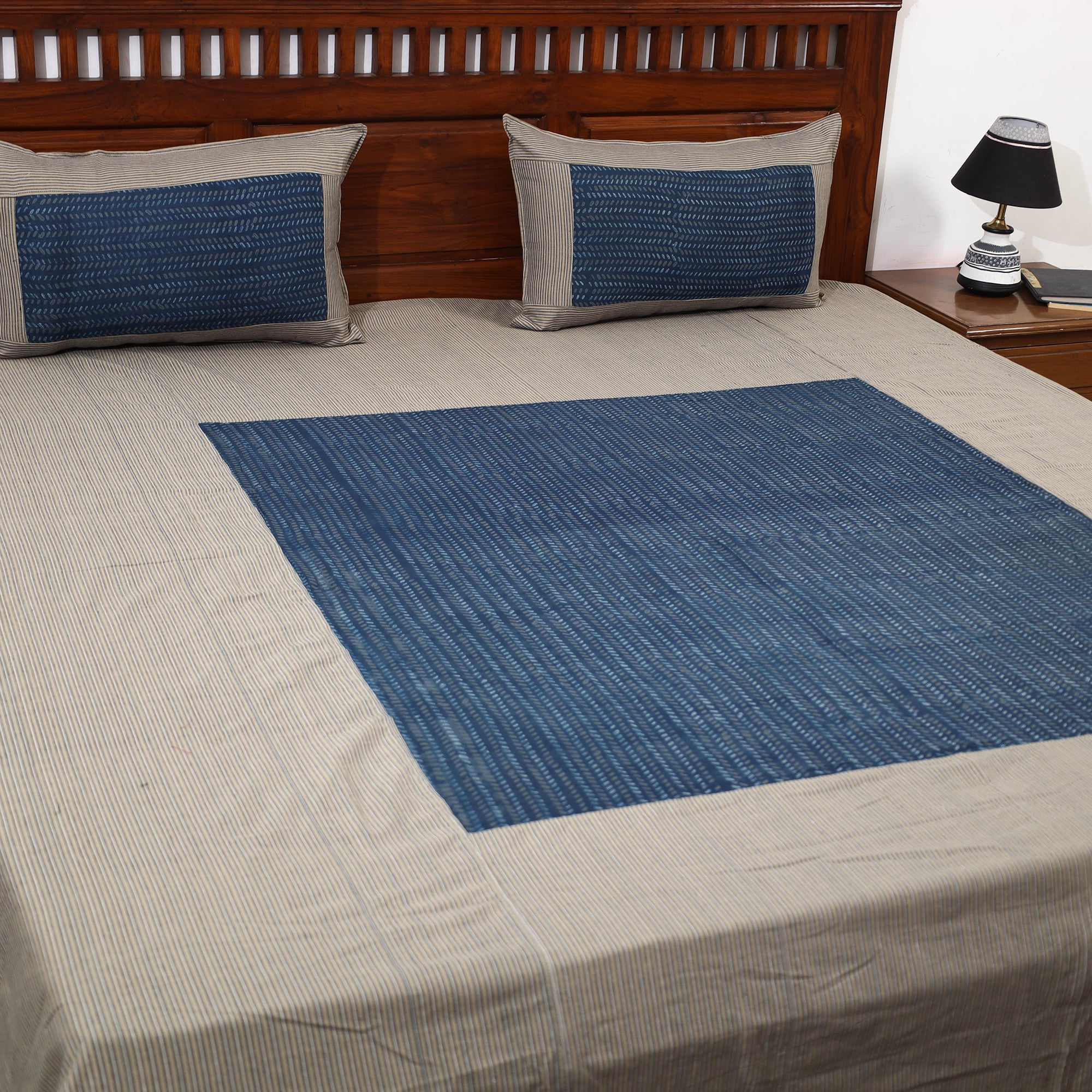 Elevate your bedroom aesthetics with our exquisite plain cotton double bedcover, featuring intricate block print patchwork, and accompanied by matching pillow covers. Crafted from high-quality cotton, it offers comfort and style. This enhancing your sleep space with a touch of elegance. Perfect for indulging in luxurious relaxation while adding a fashionable flair to your home decor.