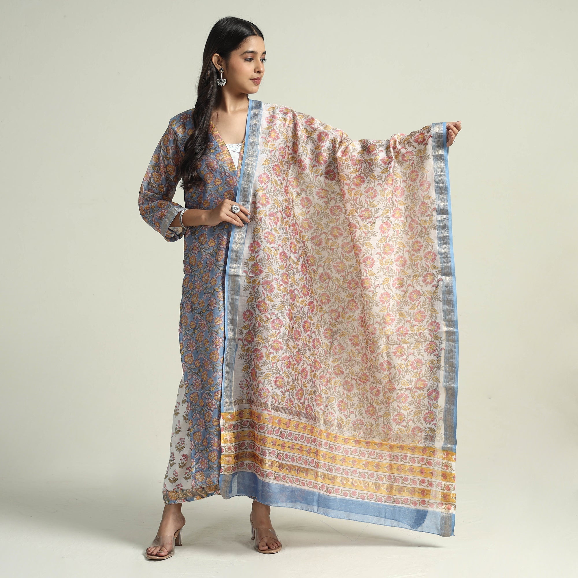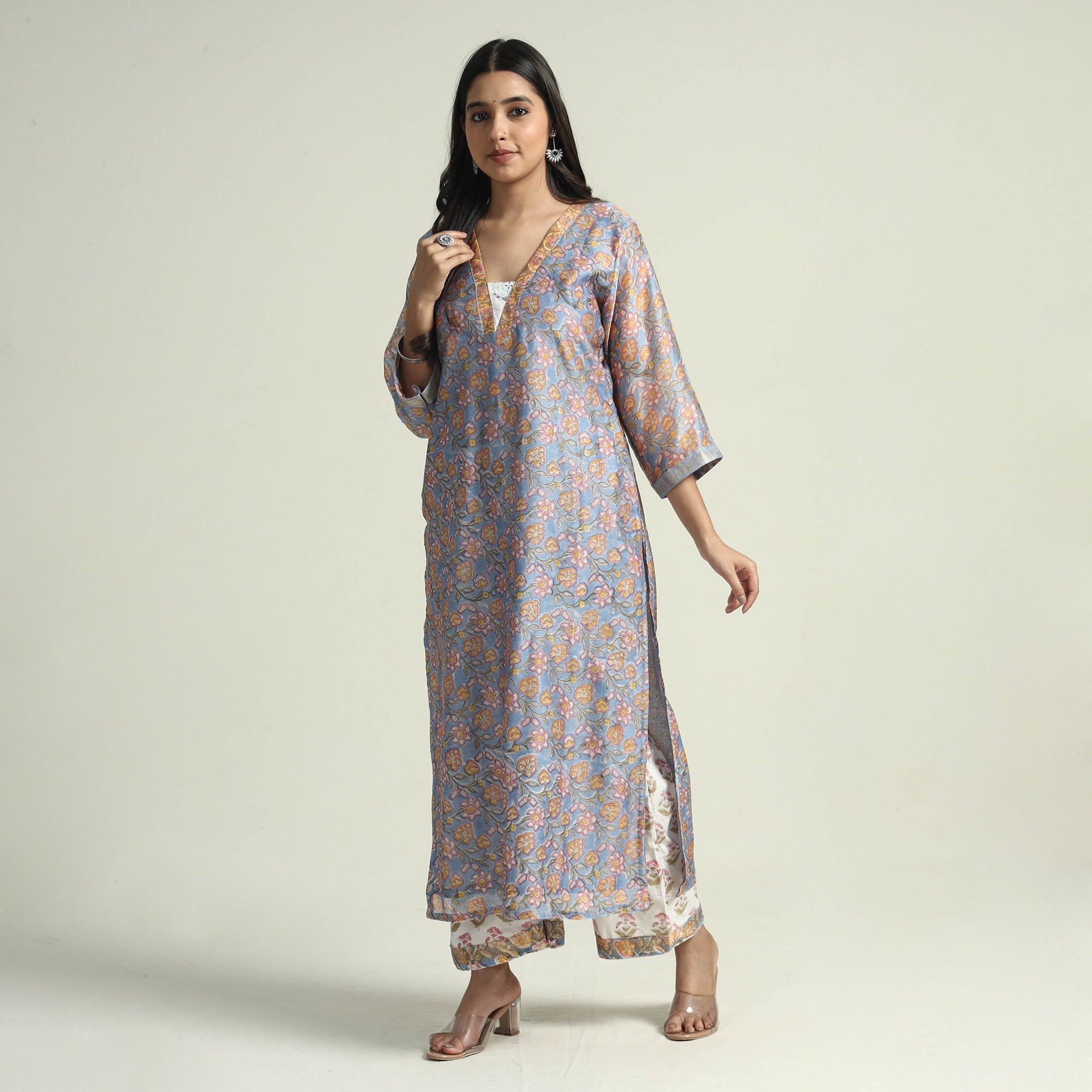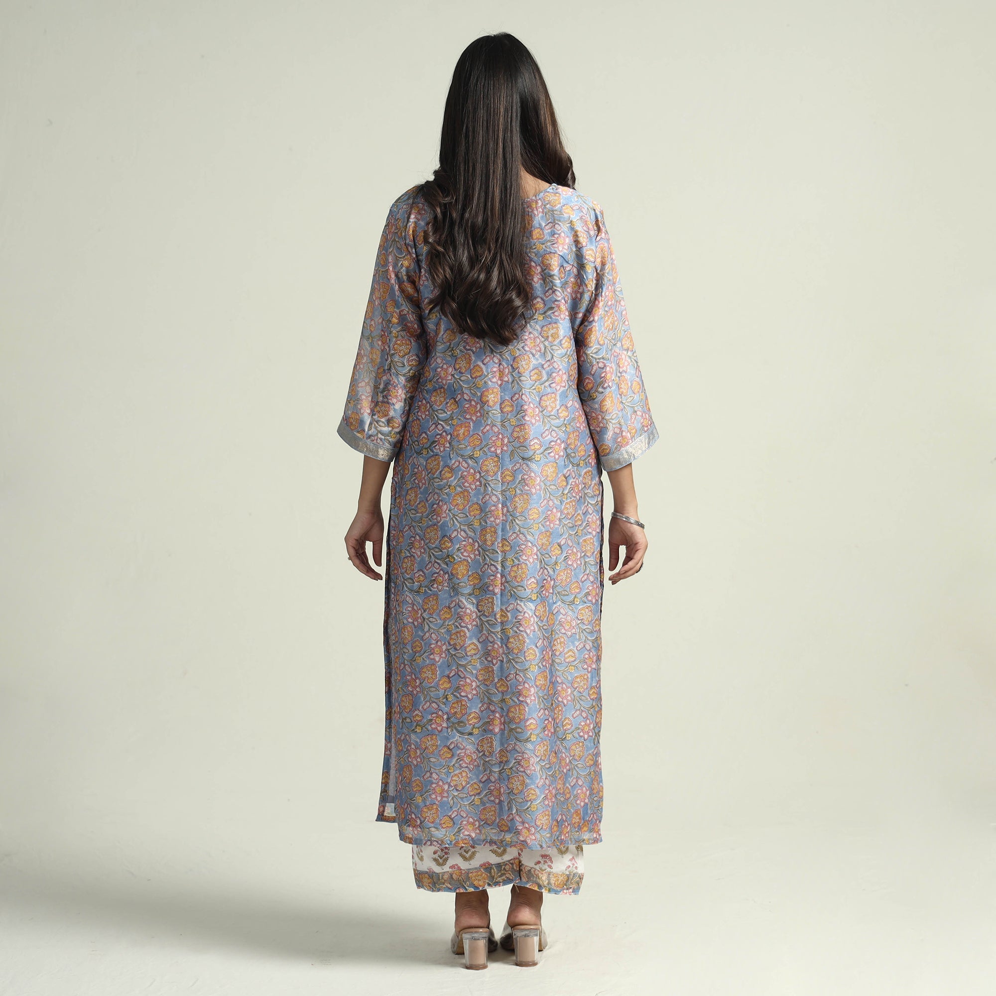 Material Embrace the elegance of handcrafted beauty with our sanganeri hand block printed maheshwari silk long kurta with palazzo & dupatta set. This suit set includes a maheshwari silk kurta, cotton palazzo with maheshwari silk zari border dupatta. The kurta also features a convenient one-side pocket, perfect for carrying small essentials, and the palazzo features an elasticized waist and two side pockets, adding functionality to this palazzo. Perfect for special occasions and celebrations, this elegant suit exudes traditional charm with its hand-block printed motifs.