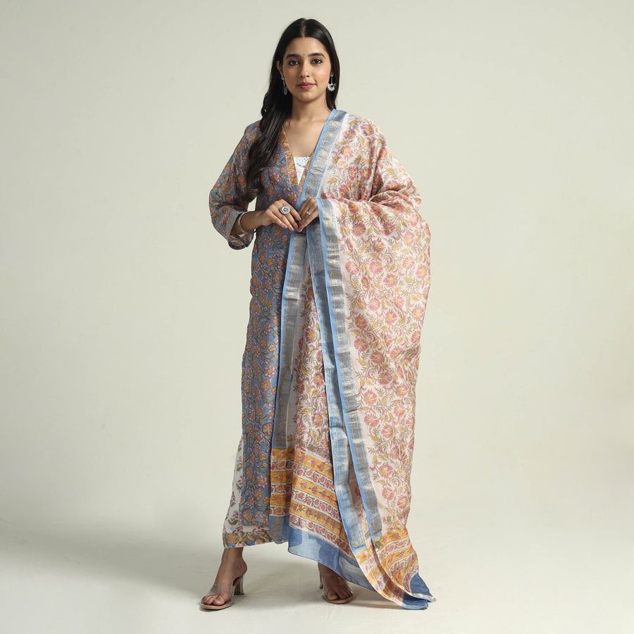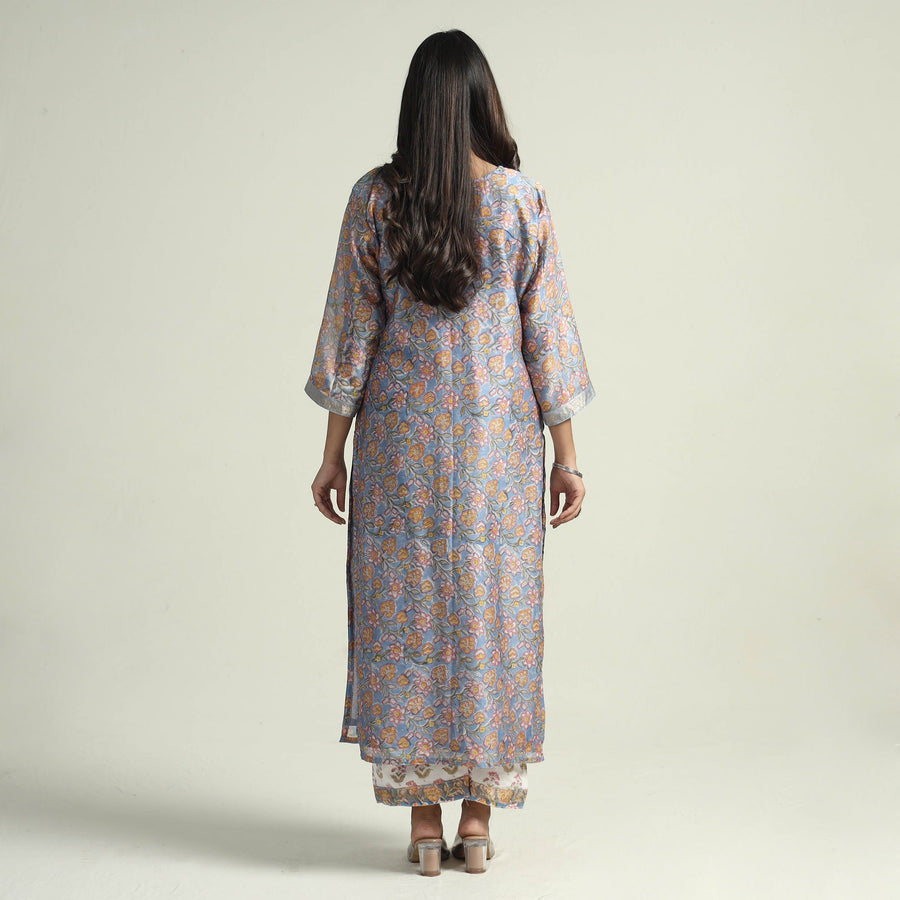 Blue - - Sanganeri Block Printed Maheshwari Silk Kurta with Palazzo & Dupatta Set