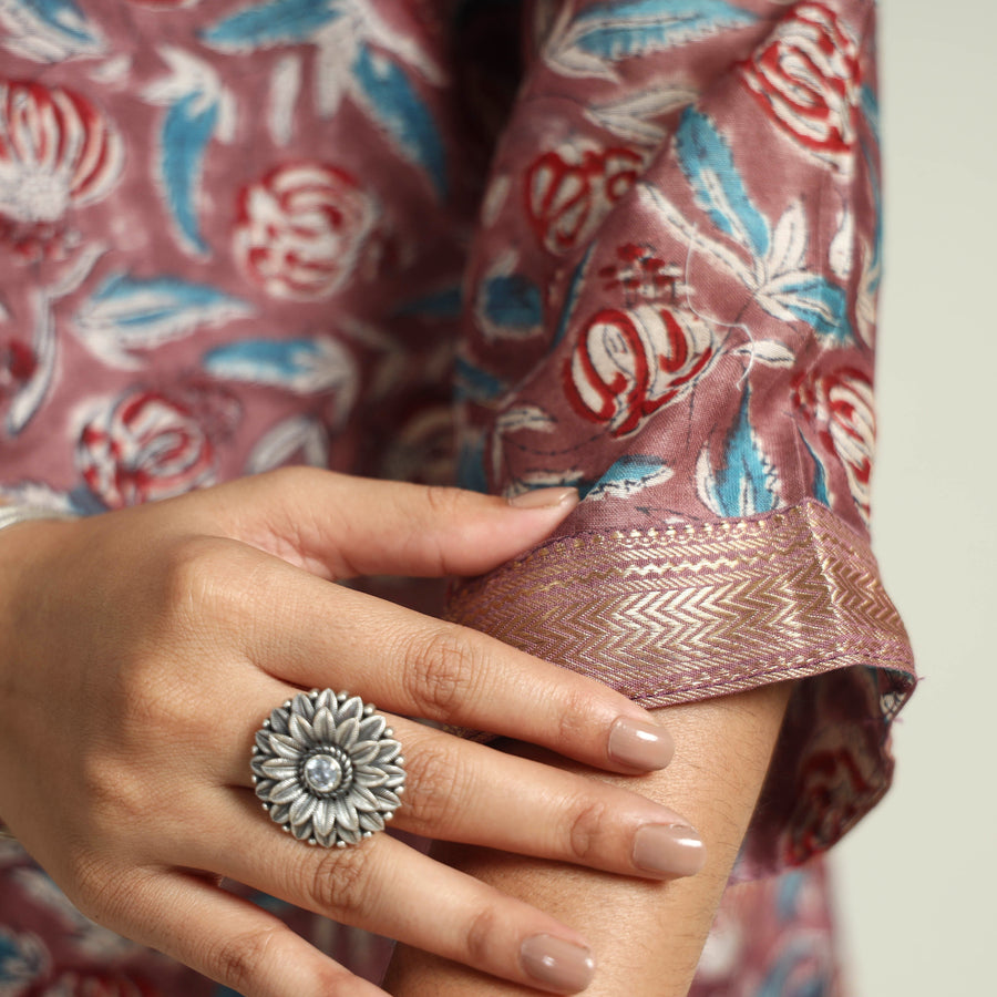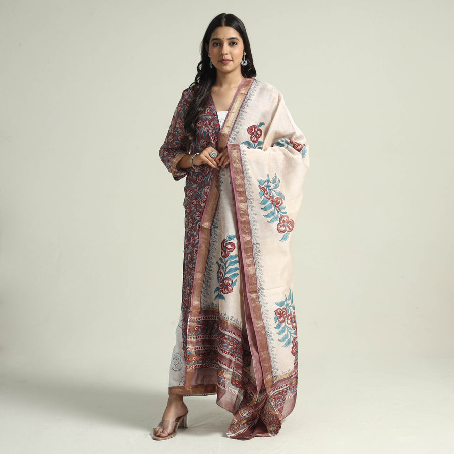Material Embrace the elegance of handcrafted beauty with our sanganeri hand block printed maheshwari silk long kurta with palazzo & dupatta set. This suit set includes a maheshwari silk kurta, cotton palazzo with maheshwari silk zari border dupatta. The kurta also features a convenient one-side pocket, perfect for carrying small essentials, and the palazzo features an elasticized waist and two side pockets, adding functionality to this palazzo. Perfect for special occasions and celebrations, this elegant suit exudes traditional charm with its hand-block printed motifs.