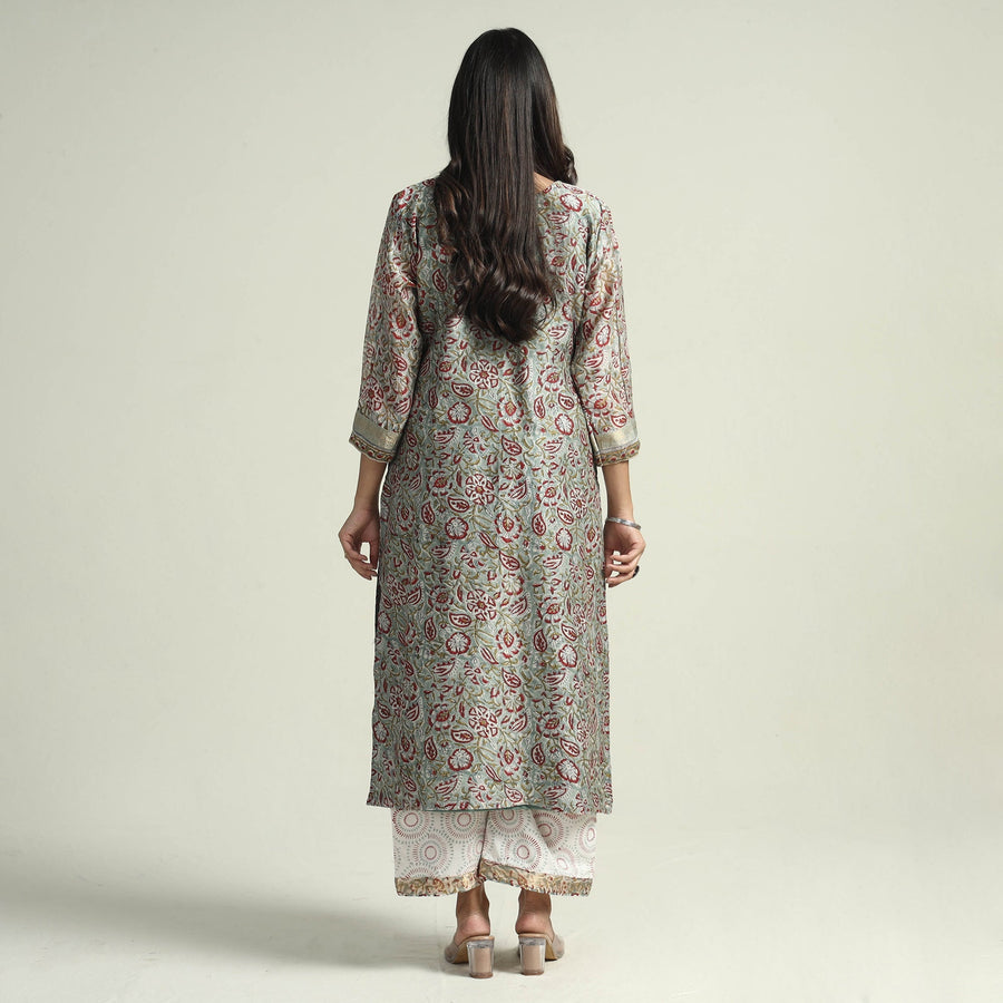 Green - Sanganeri Block Printed Maheshwari Silk Kurta with Palazzo & Dupatta Set