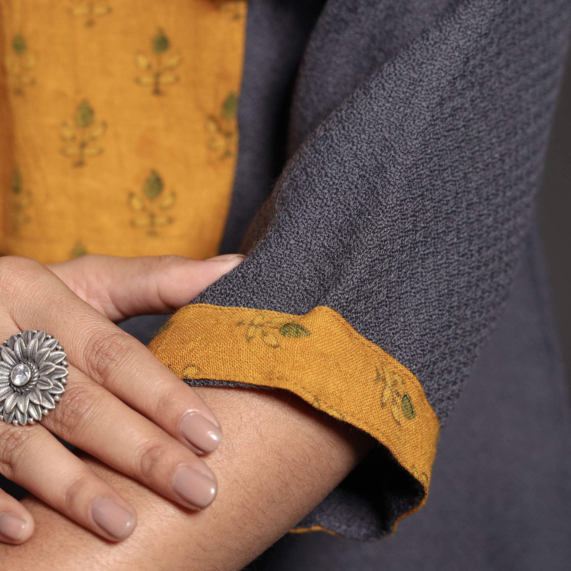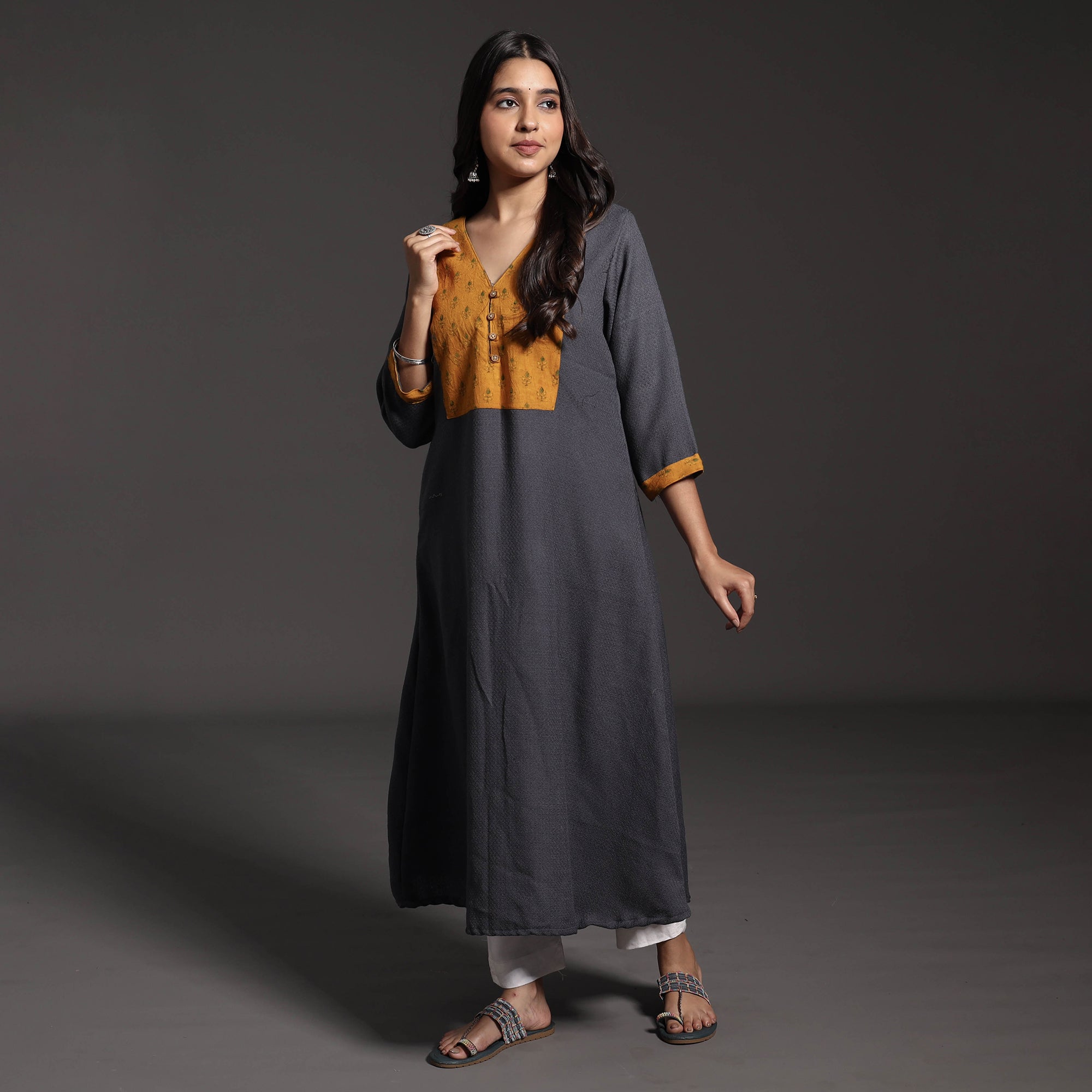 Look and feel beautiful in this uniquely designed kumaun handwoven straight merino woolen kurta with ajrakh patchwork. This woolen kurta will keep you comfortable and warm all day long this winter season, and the and natural fibres and hand-spun soft texture ensure that this kurta will give a soft and soothing touch against your skin. The kurta also features a convenient one-side pocket, perfect for carrying small essentials. It's an ideal choice for both casual and festive occasions.