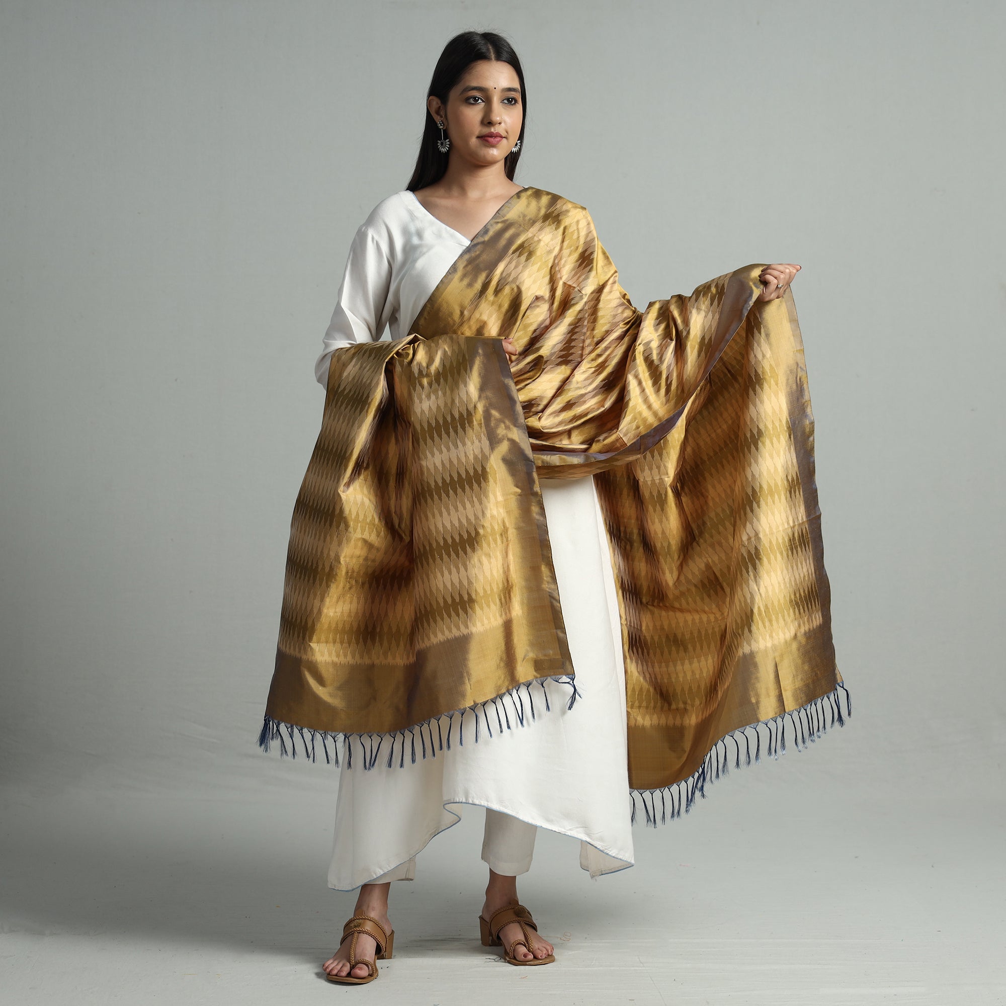 Fine quality pochampally ikat weave pure silk handloom dupatta from telangana. Ikat is a dyeing technique used to pattern textiles that employs a resist dyeing process similar to tie-dye on either the warp or weft fibers prior to dyeing. Elevate your attire with this cultural masterpiece, perfect for adding a touch of heritage to any ensemble. Ikat has lovely patterns and are world famous for their extremely beautiful colors, texture and designs. Indian Ikat is always admired by the fashion designers around the world.