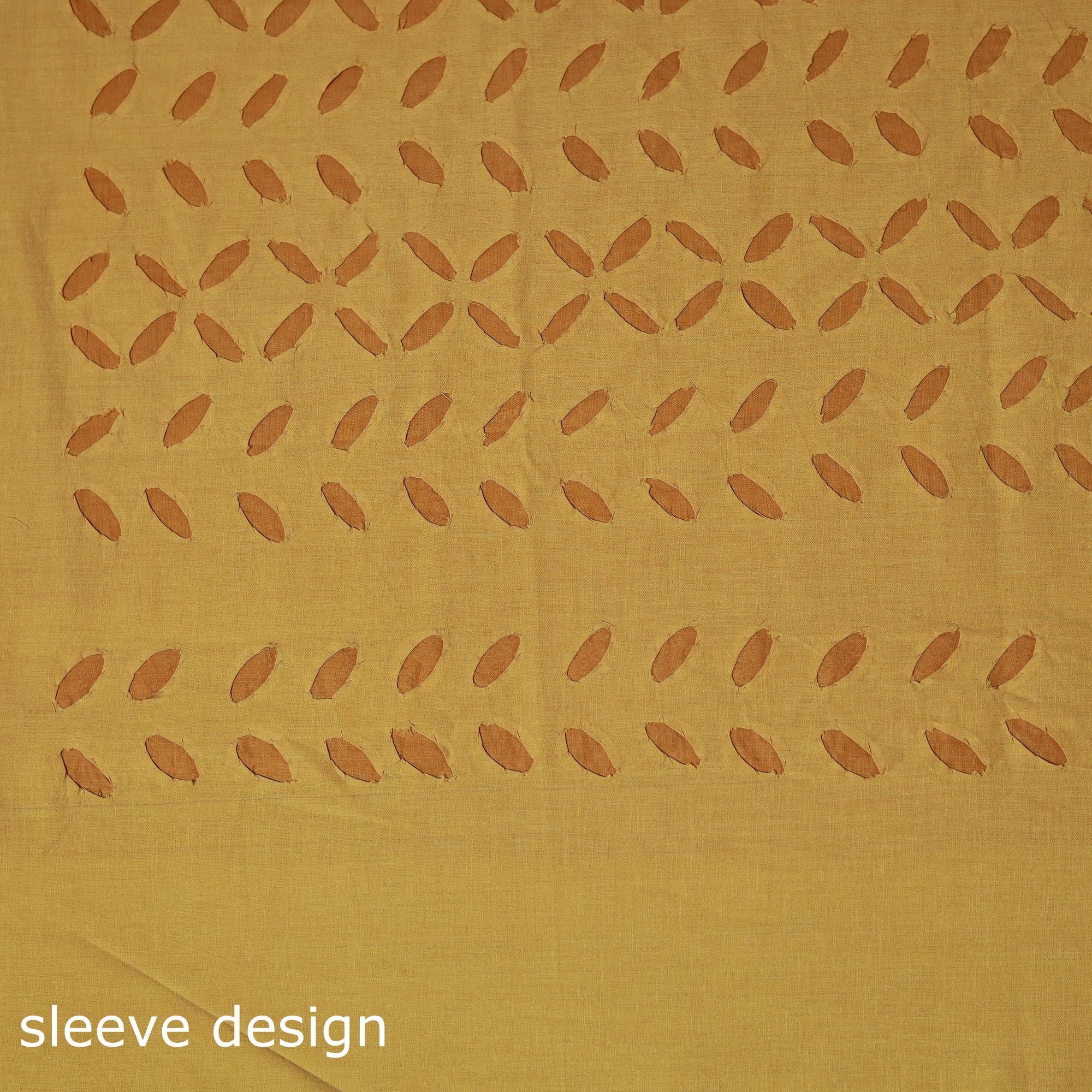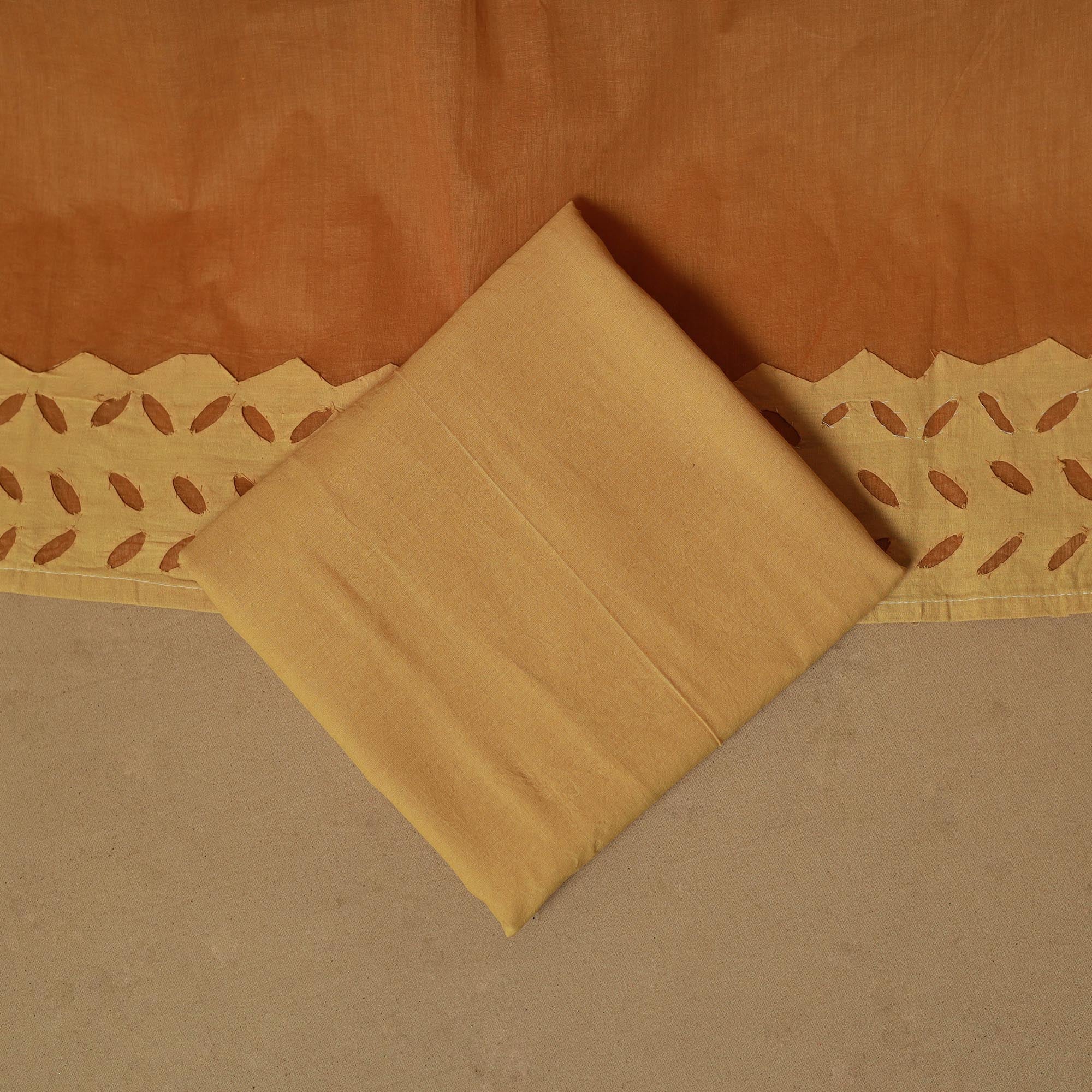 Elevate your wardrobe with our exquisite yellow 3-piece cotton dress material set from Barmer, Rajasthan. It's unique style applique work does magic in light and shade with beautiful stories and patterns. (the set comes with a plain colour matching bottom/salwar piece). Meticulously hand-stitched and adorned with intricate appliqué cutwork, this fine-quality cotton ensemble exudes timeless elegance. Ideal for special occasions, the set offers versatility create stunning traditional suits, kurta sets, or mix and match for a personalized, sophisticated look.