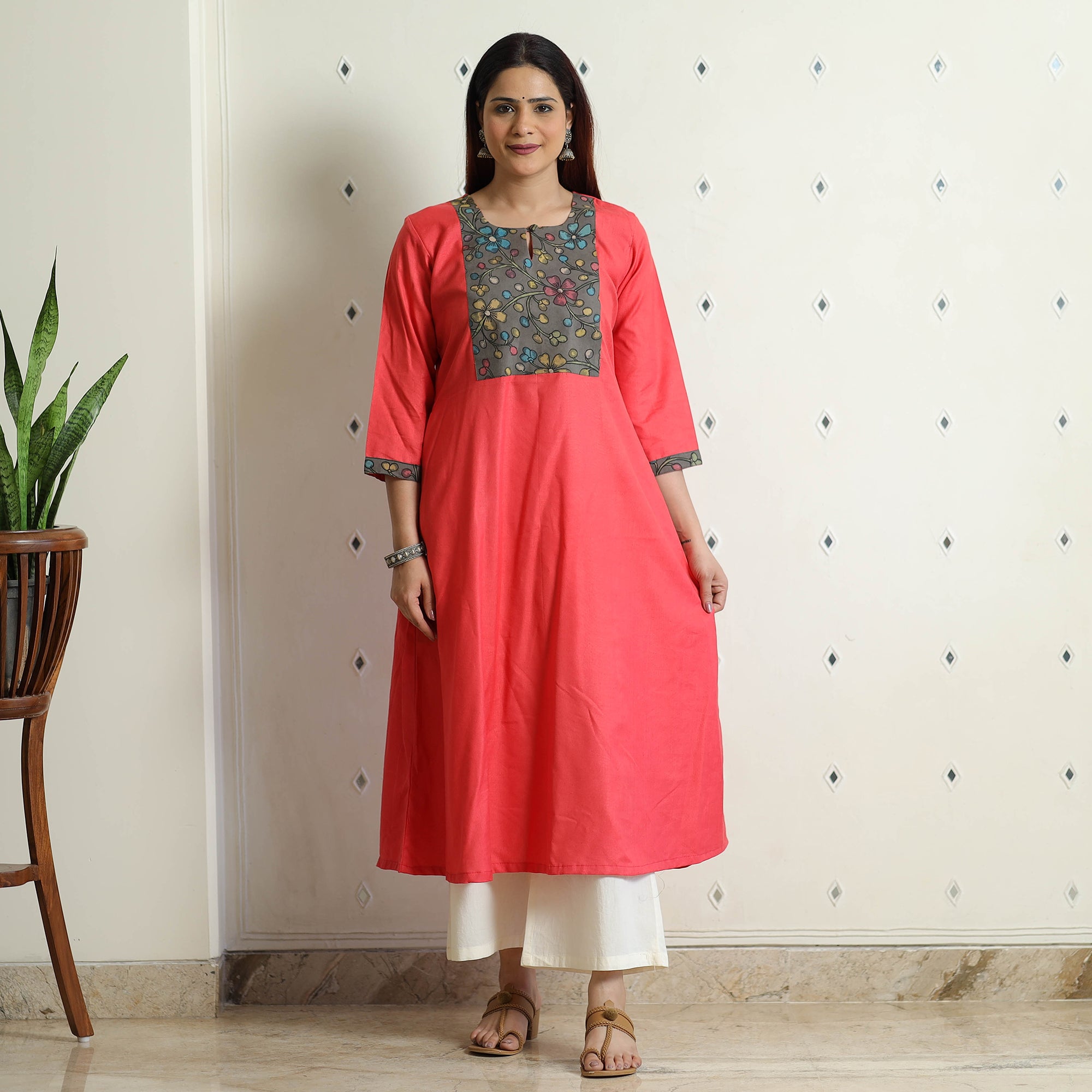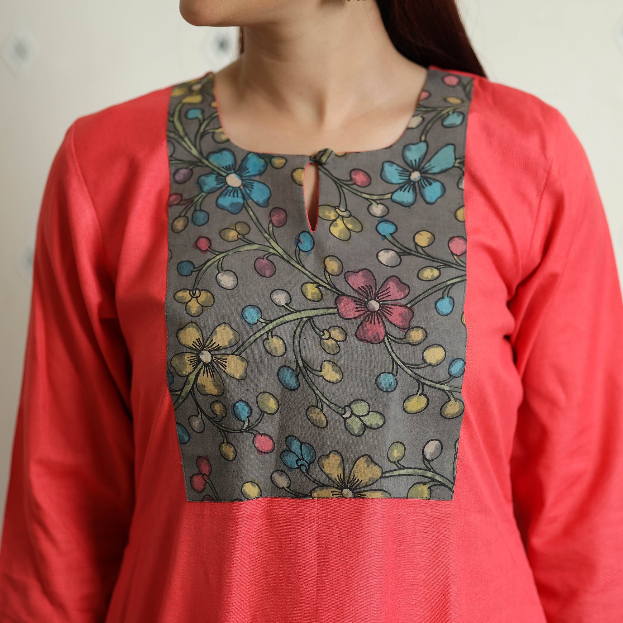 Look and feel beautiful in this uniquely designed srikalahasti kalamkari patchwork plain linen cotton long kurta. This exquisite kurta is crafted from the finest quality Bhagalpuri viscose cotton blend linen fabric, ensuring a comfortable feel against your skin. It boasts an exquisite srikalahasti kalamkari patchwork design, adding a touch of elegance to your ensemble. The kurta also features a convenient one-side pocket, perfect for carrying small essentials. It's an ideal choice for both casual and festive occasions.