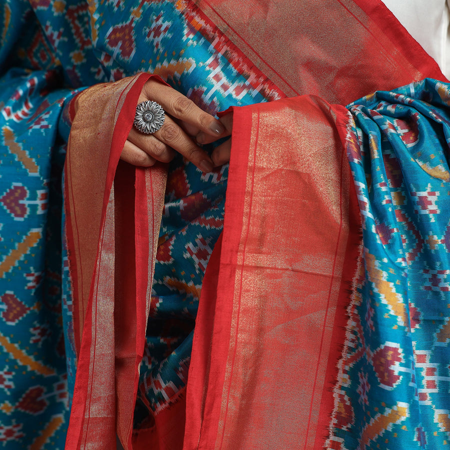 Fine quality pure handspun handwoven pochampally ikat silk dupatta with zari border from Telangana. Ikat (Ikkat) is a dyeing technique used to pattern textiles that employs a resist dyeing process similar to tie-dye on either the warp or weft fibers prior to dyeing. Ikat has lovely patterns and are world famous for their extremely beautiful colors, texture and designs. Indian Ikat is always admired by the fashion designers around the world. Adorned with chic tassels, it effortlessly enhances both casual and formal ensembles, adding a touch of cultural charm and elegance to your wardrobe.
