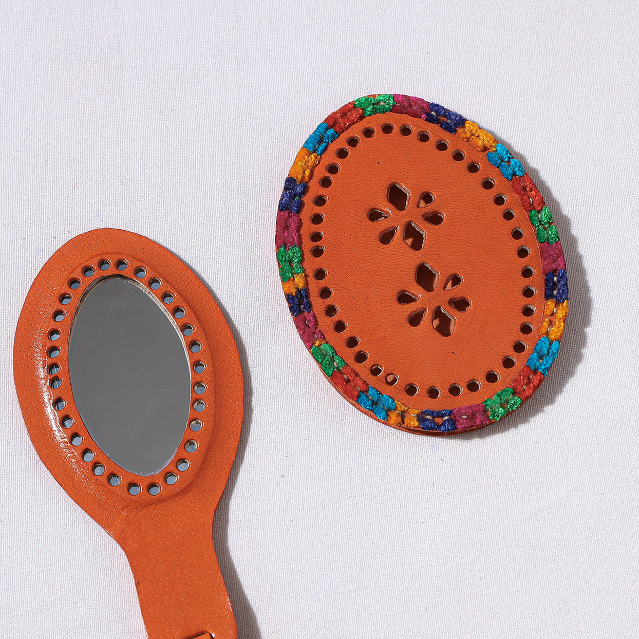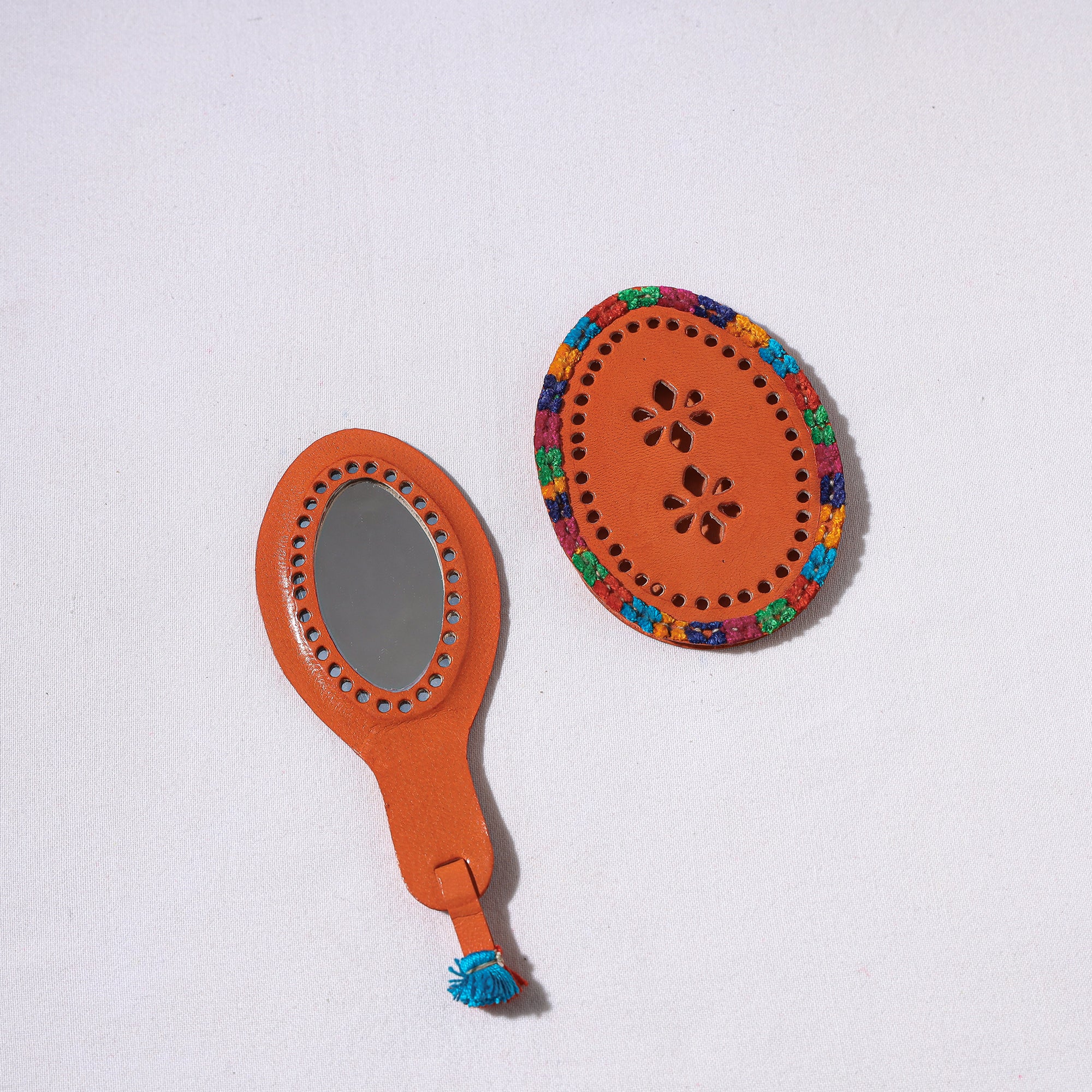 This exquisite handcrafted orange kutch cutwork leather hand mirror with pouch is made by the skilled artisans of Kutch from cruelty free natural leather & glass mirror. This handicrafted art tradition of the tribal community of Kutch district in Gujarat. This exquisite mirror, accompanied by a pouch, adds elegance to your grooming routine with a touch of cultural heritage.