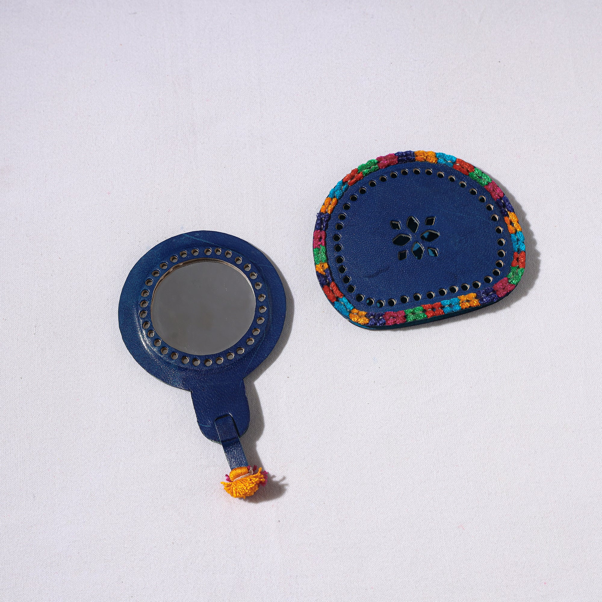 This exquisite handcrafted blue kutch cutwork leather hand mirror with pouch is made by the skilled artisans of Kutch from cruelty free natural leather & glass mirror. This handicrafted art tradition of the tribal community of Kutch district in Gujarat. This exquisite mirror, accompanied by a pouch, adds elegance to your grooming routine with a touch of cultural heritage.