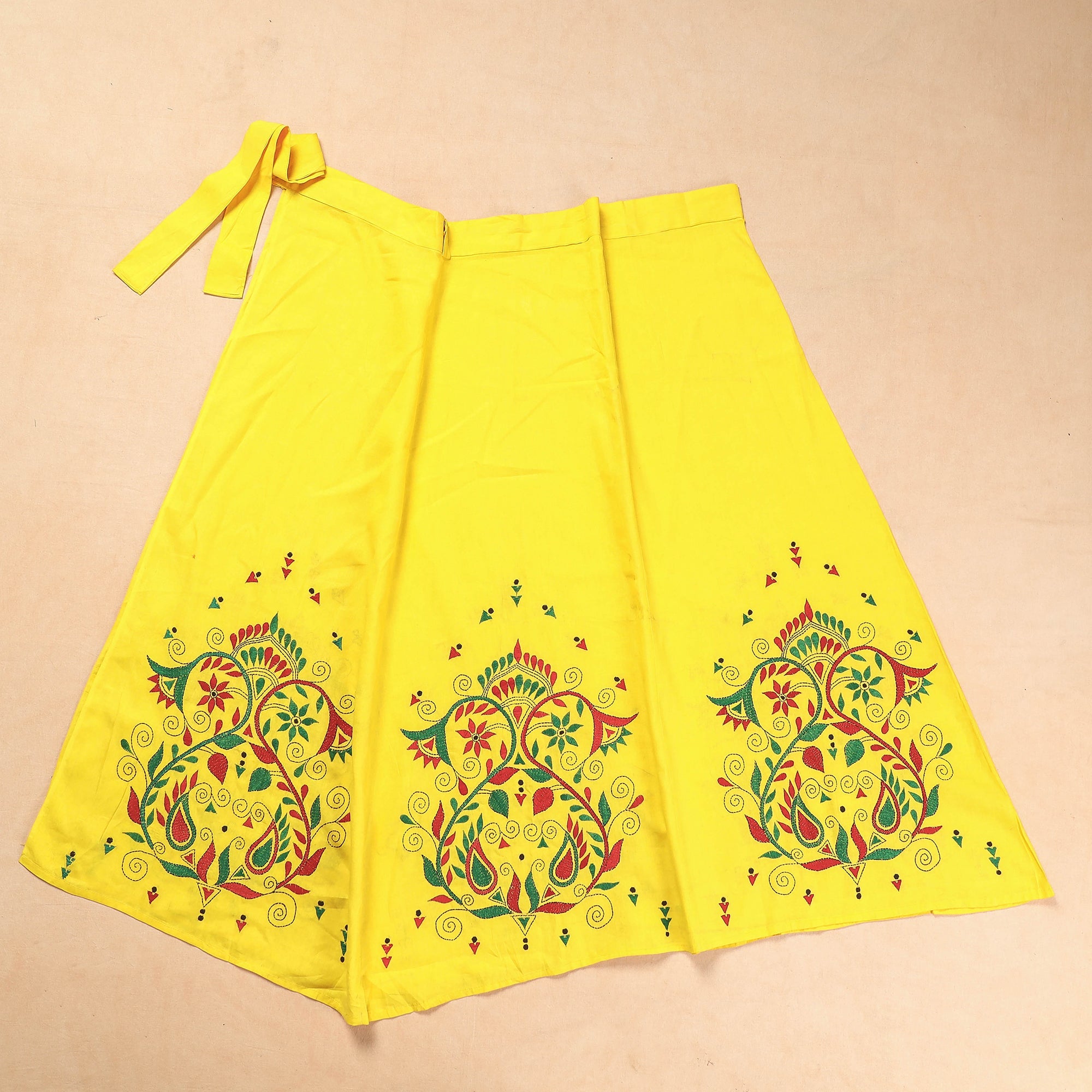 This exquisite wrap around skirt is made of pure cotton and is beautifully embroidered with traditional Kantha patterns. The waist tie-up closure adds to its comfort and versatility. Handcrafted using the traditional Kantha hand embroidery technique from West Bengal, this skirt is a perfect blend of style and heritage. Get ready to turn heads with this stunning piece of ethnic wear.