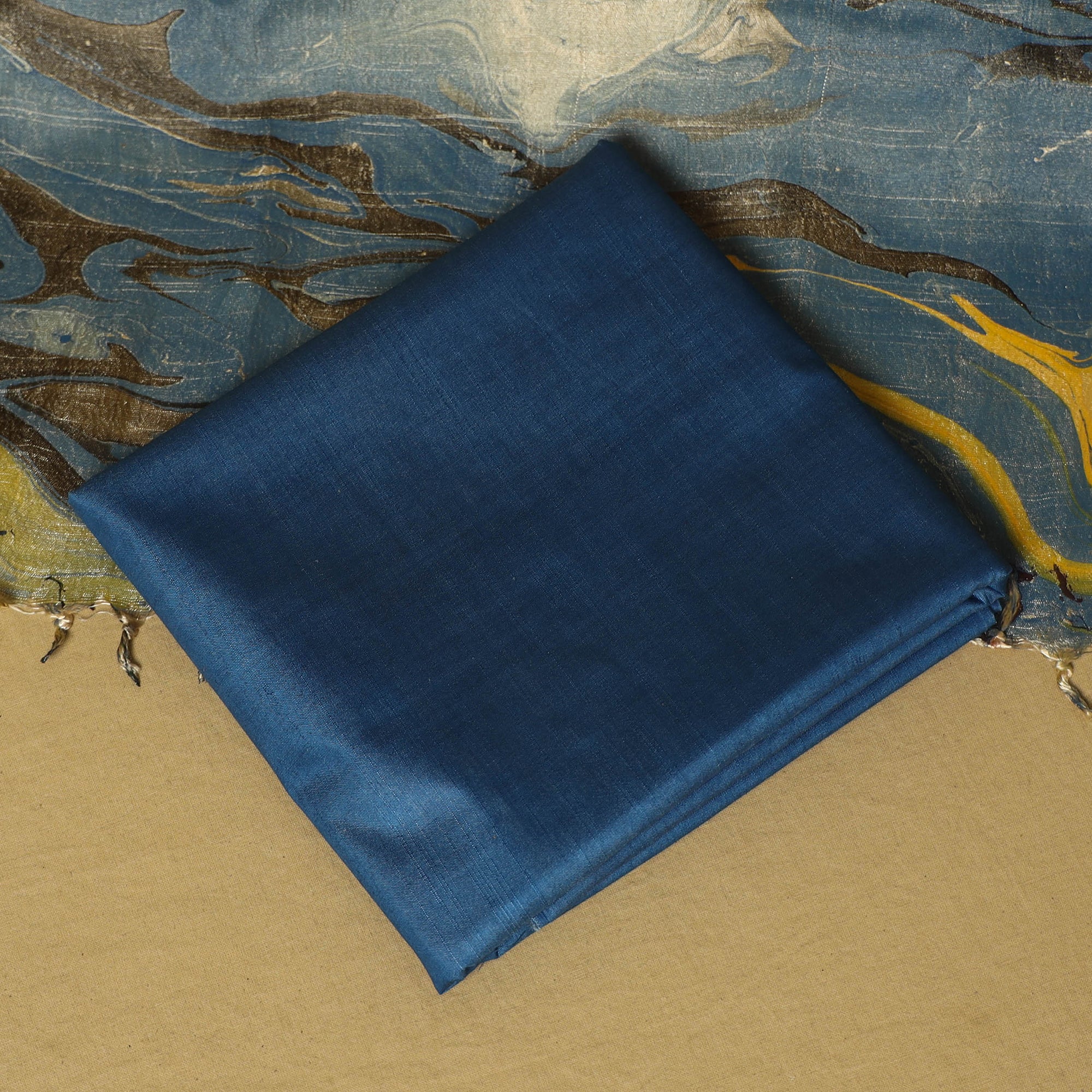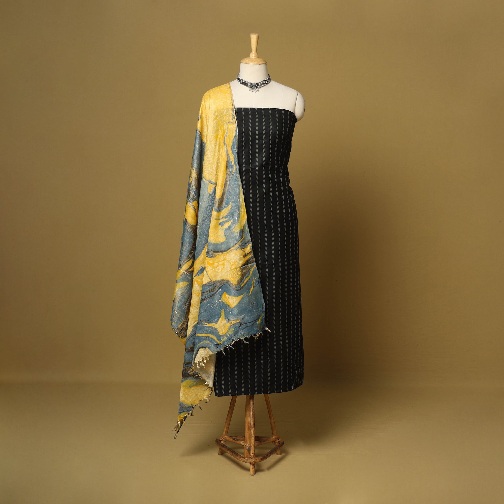 Fine quality black handloom mulberry kurta material & bottom material set with banana silk dupatta that showcases beautifully handwoven textures from Bhagalpur. It has sheen on one side and marble print on another. Marbling is a method of aqueous surface design, which can produce patterns similar to smooth marble or other kinds of stone. The patterns are the result of color floated on either plain water or a viscous solution known as size, and then carefully transferred to an absorbent surface, like fabric. Mulberry silk known for its shine and softness. It is one of the most renowned and popular forms of Silk, particularly when it comes to textiles.