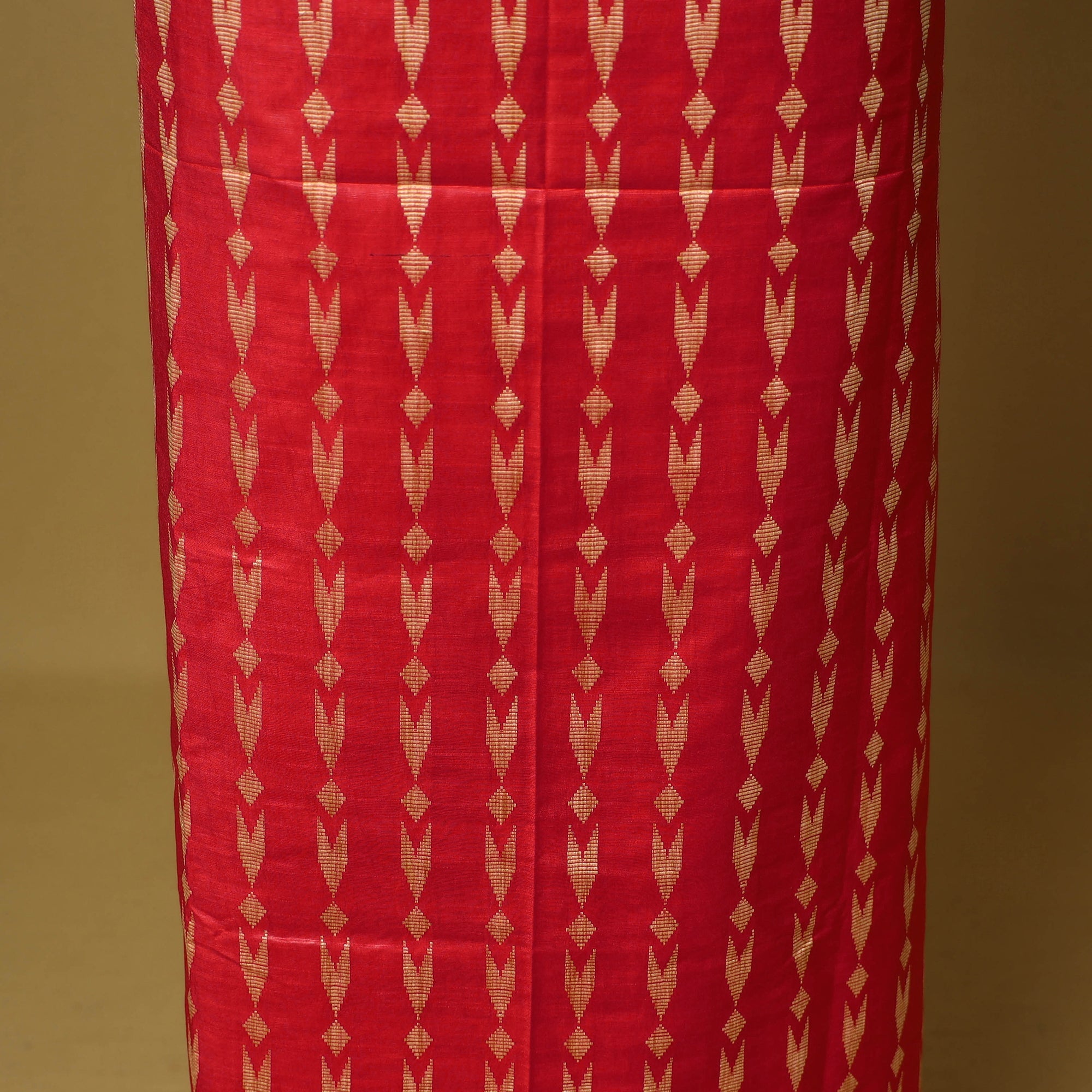 Fine quality red handloom mulberry kurta material & bottom material set with banana silk dupatta that showcases beautifully handwoven textures from Bhagalpur. It has sheen on one side and marble print on another. Marbling is a method of aqueous surface design, which can produce patterns similar to smooth marble or other kinds of stone. The patterns are the result of color floated on either plain water or a viscous solution known as size, and then carefully transferred to an absorbent surface, like fabric. Mulberry silk known for its shine and softness. It is one of the most renowned and popular forms of Silk, particularly when it comes to textiles.