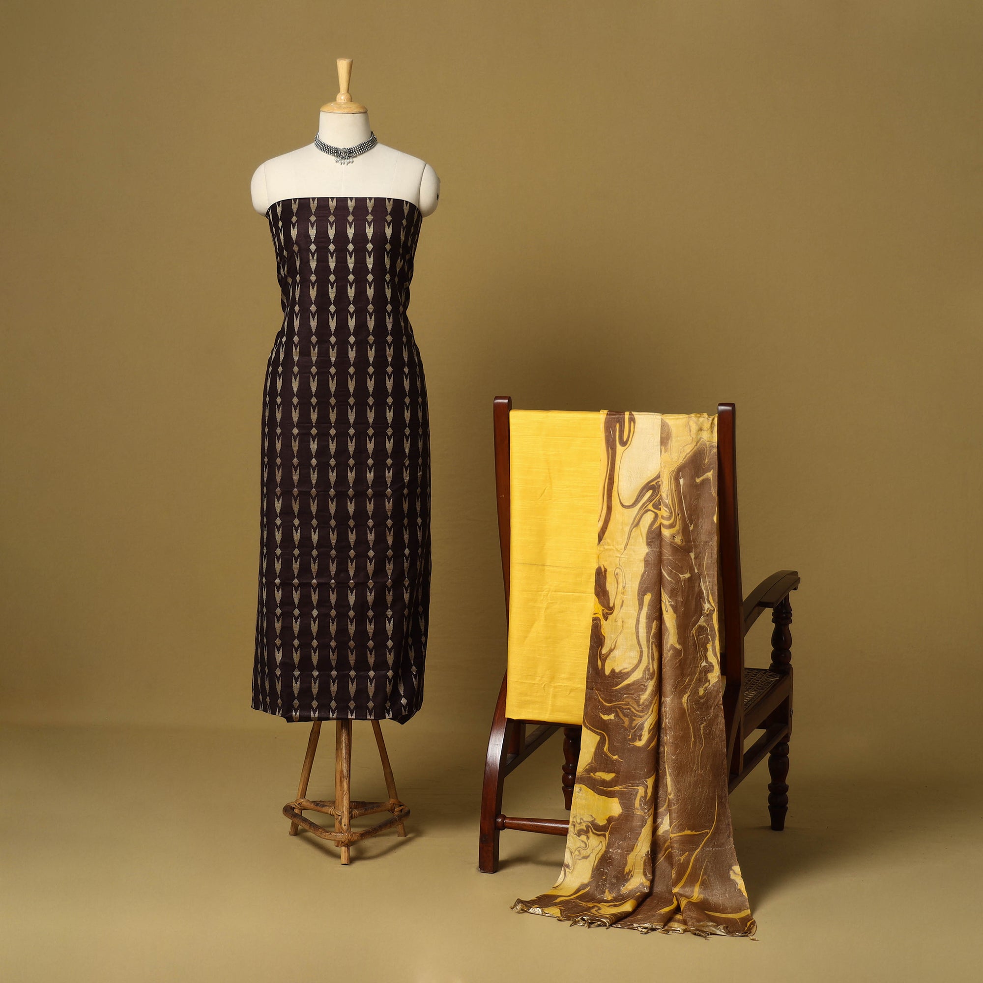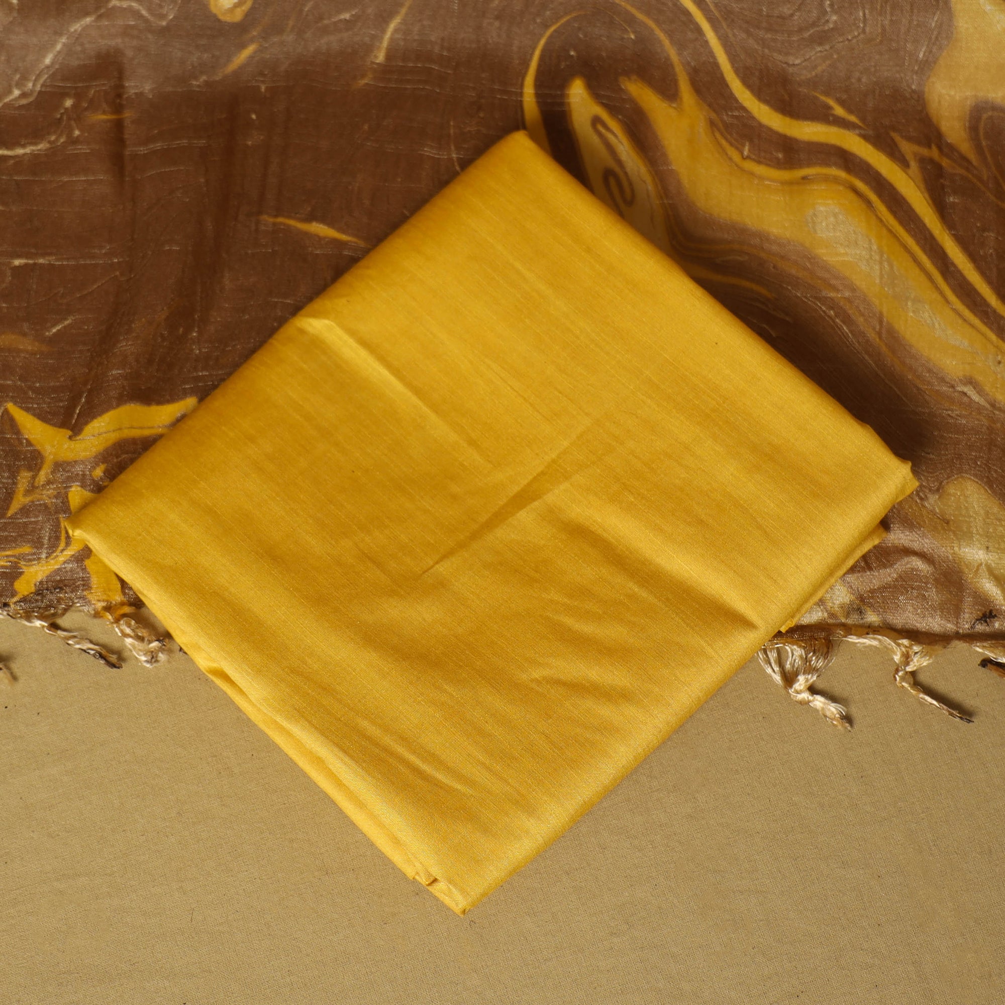 Fine quality brown handloom mulberry kurta material & bottom material set with banana silk dupatta that showcases beautifully handwoven textures from Bhagalpur. It has sheen on one side and marble print on another. Marbling is a method of aqueous surface design, which can produce patterns similar to smooth marble or other kinds of stone. The patterns are the result of color floated on either plain water or a viscous solution known as size, and then carefully transferred to an absorbent surface, like fabric. Mulberry silk known for its shine and softness. It is one of the most renowned and popular forms of Silk, particularly when it comes to textiles.