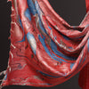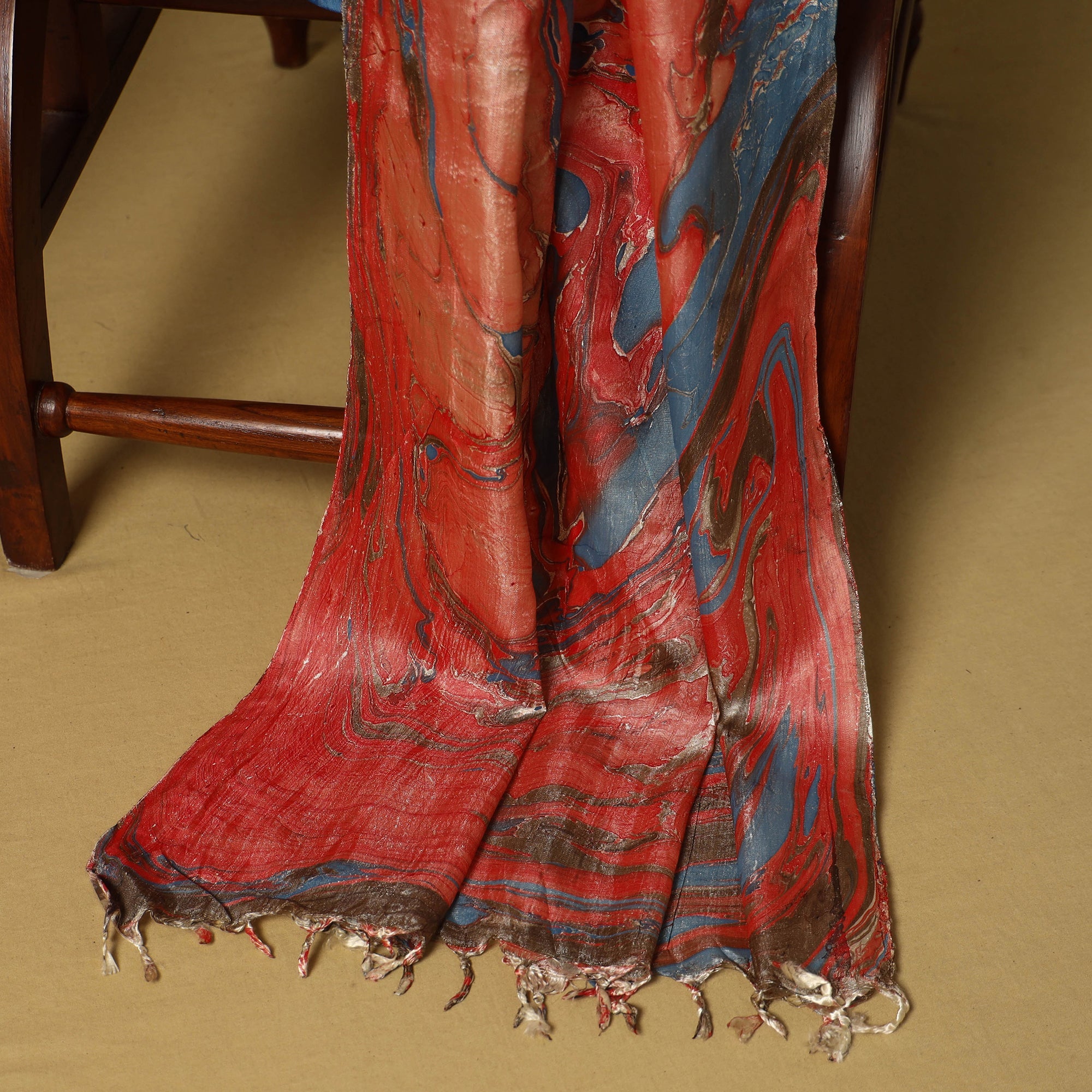 Fine quality red handloom mulberry kurta material & bottom material set with banana silk dupatta that showcases beautifully handwoven textures from Bhagalpur. It has sheen on one side and marble print on another. Marbling is a method of aqueous surface design, which can produce patterns similar to smooth marble or other kinds of stone. The patterns are the result of color floated on either plain water or a viscous solution known as size, and then carefully transferred to an absorbent surface, like fabric. Mulberry silk known for its shine and softness. It is one of the most renowned and popular forms of Silk, particularly when it comes to textiles.