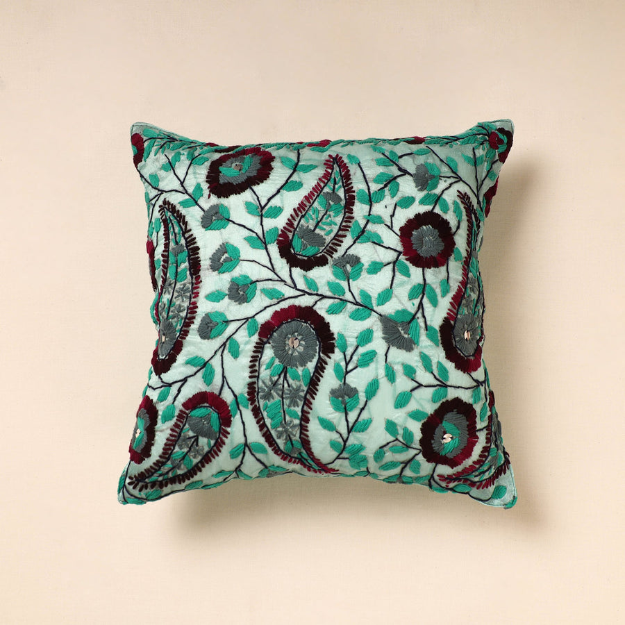 Elevate your home decor with our chanderi silk phulkari hand embroidery cushion cover skillfully embroidered on luxurious Chanderi silk. Phulkari meaning flower craft originates from Punjab reflecting centuries-old traditions of vibrant, intricate designs. Perfect for adorning sofas, beds, or chairs these covers bring elegance and cultural richness to any room.