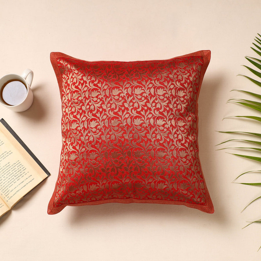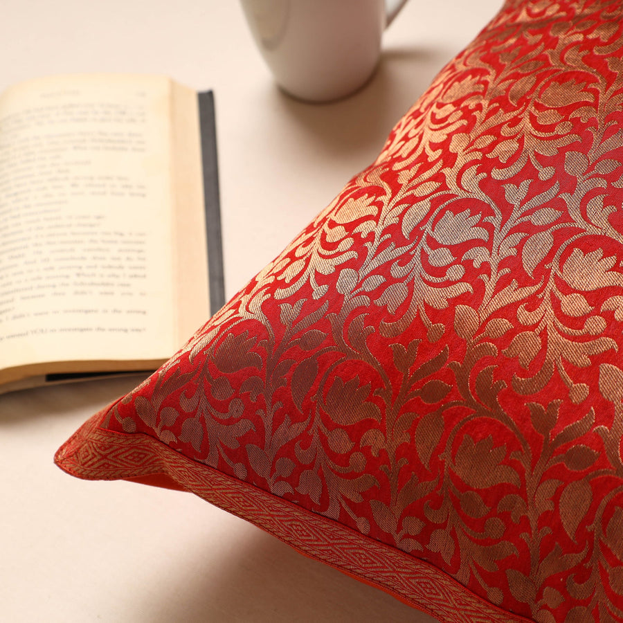 Traditional red pure banarasi silk handwoven zari cushion cover. meticulously crafted, it exudes timeless elegance, showcasing intricate zari work on lustrous silk. Elevate your home decor with this luxurious accessory, adding a touch of cultural heritage and sophistication to any space. Perfect for enhancing the beauty of sofas, chairs, or beds.
