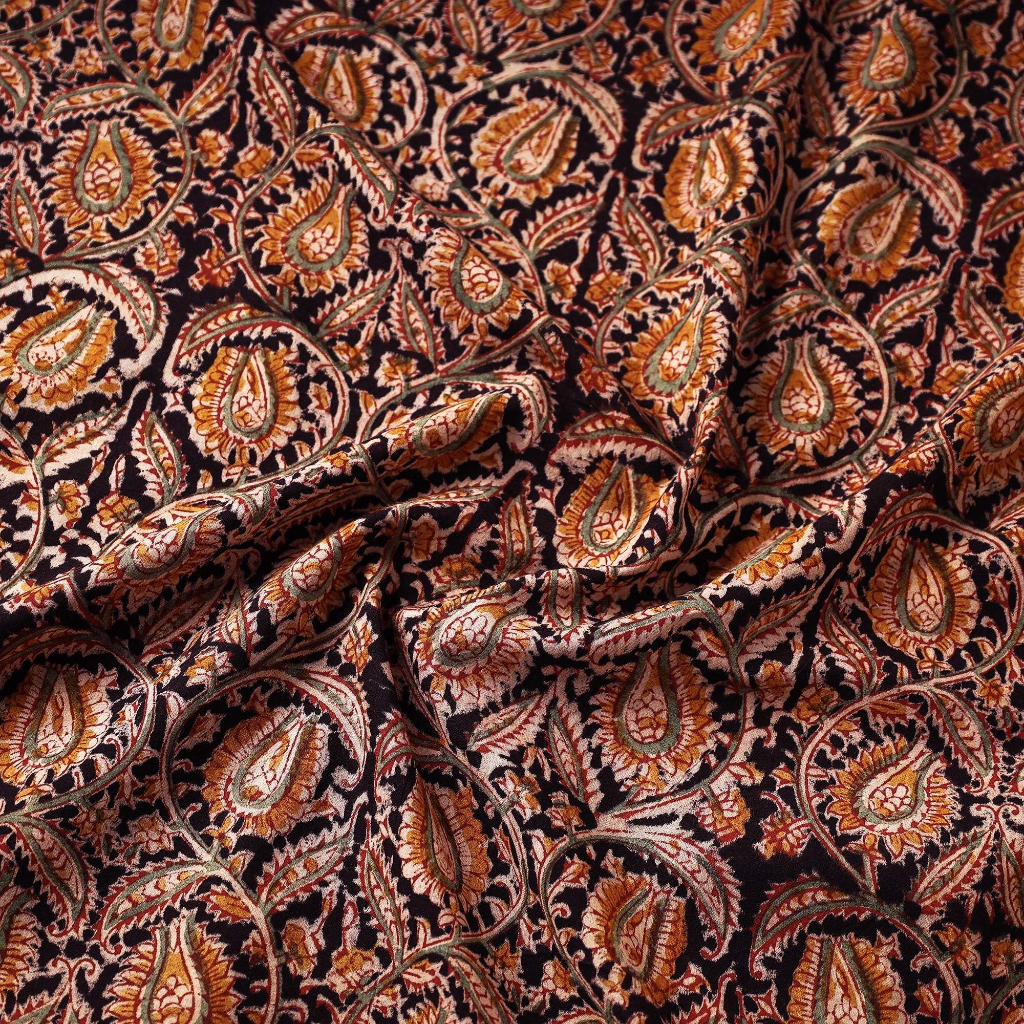 Indulge in the rich artistry of kalamkari with this fine quality black cotton fabric. Hand block printed using natural dyes, this fabric showcases an array of traditional motifs inspired by Kalamkari painting. The intricate detailing and complex techniques used by artisans from Andhra Pradesh make this fabric a masterpiece. Perfect for creating stunning apparel, home decor, or accessories with a touch of traditional elegance.