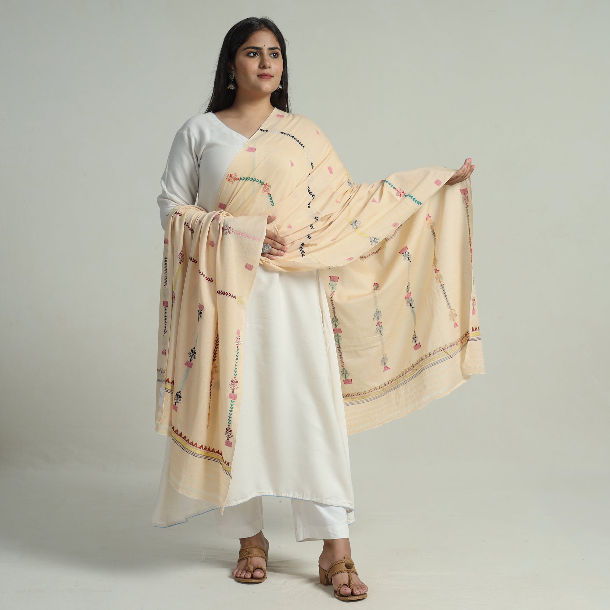 Elevate your style with our exquisite bengal kantha hand embroidery silk cotton dupatta with tassels, designed with contemporary patterns and has been hand embroidered using West Bengal's traditional craft technique of Kantha.