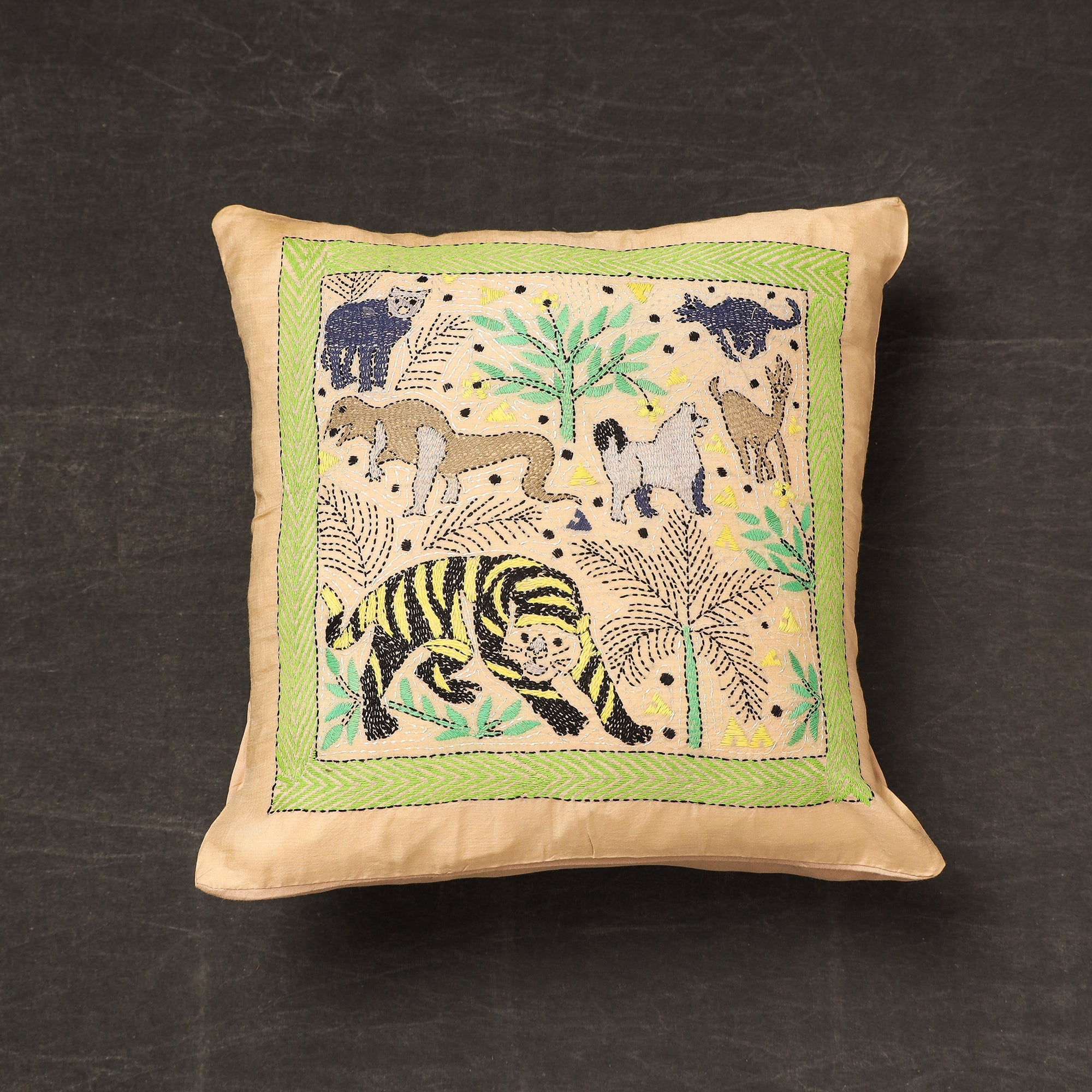 Elevate your home decor with our Bengal kantha hand embroidery silk cushion cover, showcasing contemporary patterns meticulously hand-embroidered using West Bengal's traditional Kantha technique. Crafted with precision, this exquisite cushion cover adds a touch of cultural elegance. Versatile in use, it enhances both living spaces and bedrooms, embodying the rich heritage of Bengal's artisanal craftsmanship.