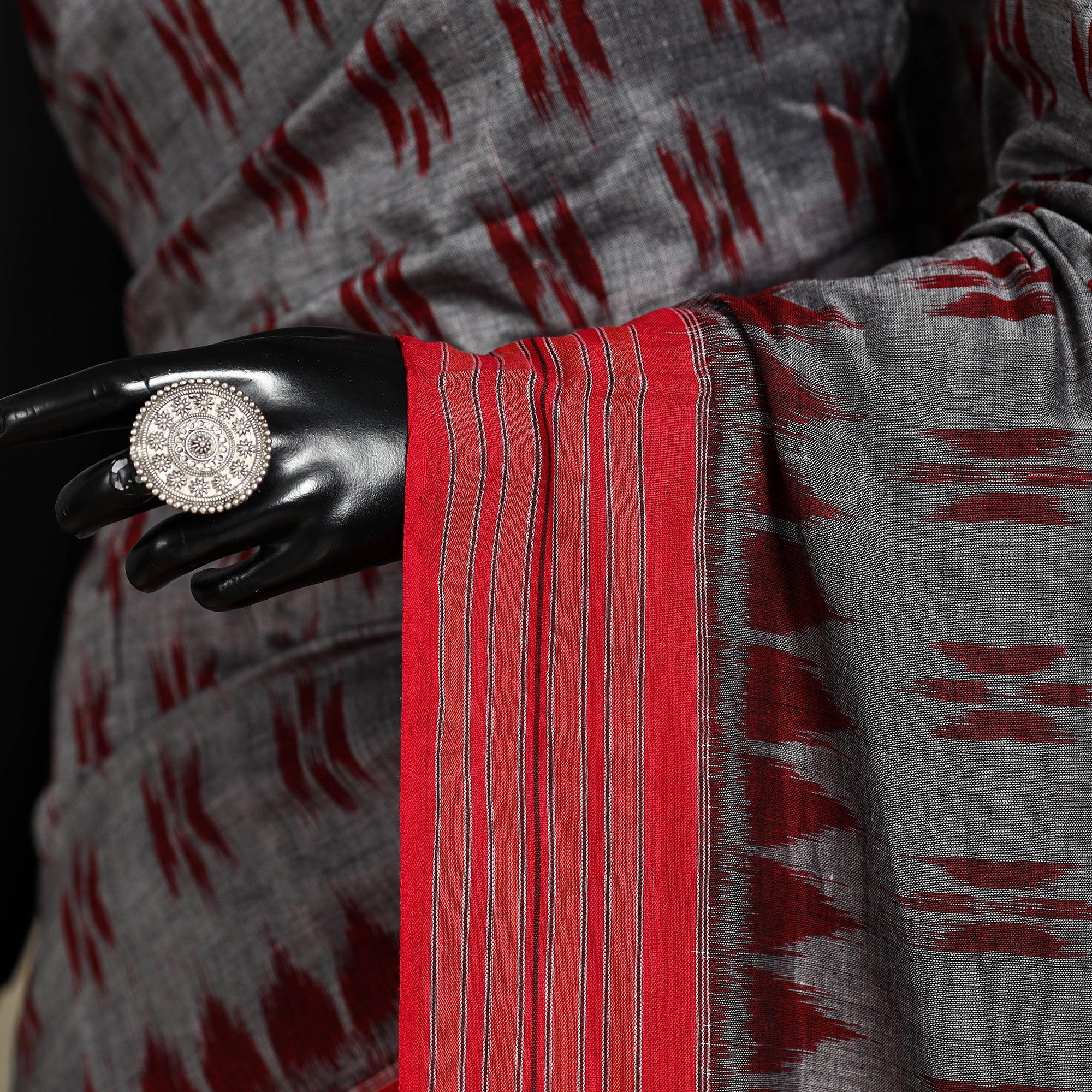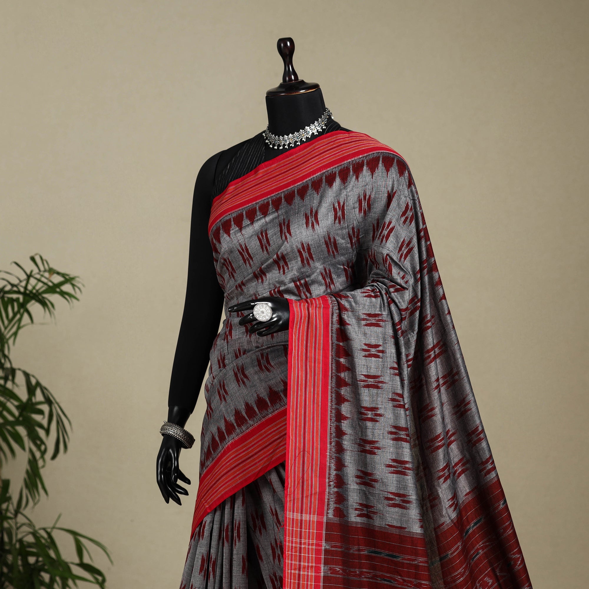 Fine quality grey sambalpuri Ikat handloom mercerised cotton saree, crafted by master artisans from the eastern state of Odisha. This exquisite saree showcases traditional motifs such as shankha (shell), chakra (wheel), and phula (flower) adding a touch of elegance to any occasion. The intricate ikat dyeing technique produces mesmerizing patterns, textures, and colours that are renowned worldwide. Indian Ikat is always admired by the fashion designers around the world.