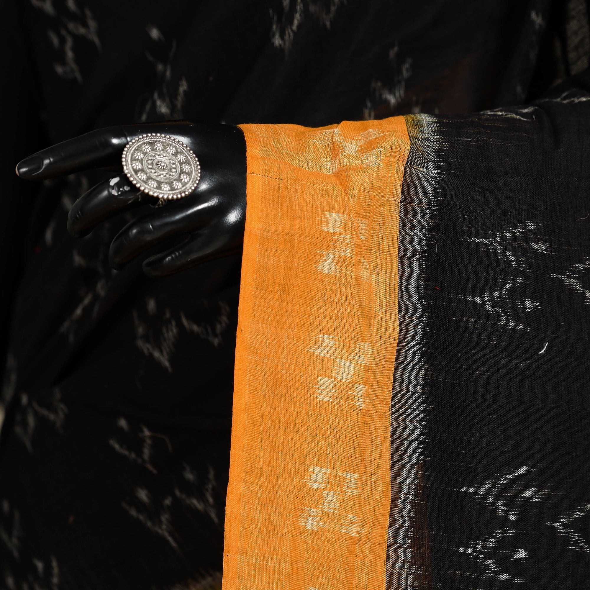 Fine quality black sambalpuri Ikat handloom mercerised cotton saree, crafted by master artisans from the eastern state of Odisha. This exquisite saree showcases traditional motifs such as shankha (shell), chakra (wheel), and phula (flower) adding a touch of elegance to any occasion. The intricate ikat dyeing technique produces mesmerizing patterns, textures, and colours that are renowned worldwide. Indian Ikat is always admired by the fashion designers around the world.