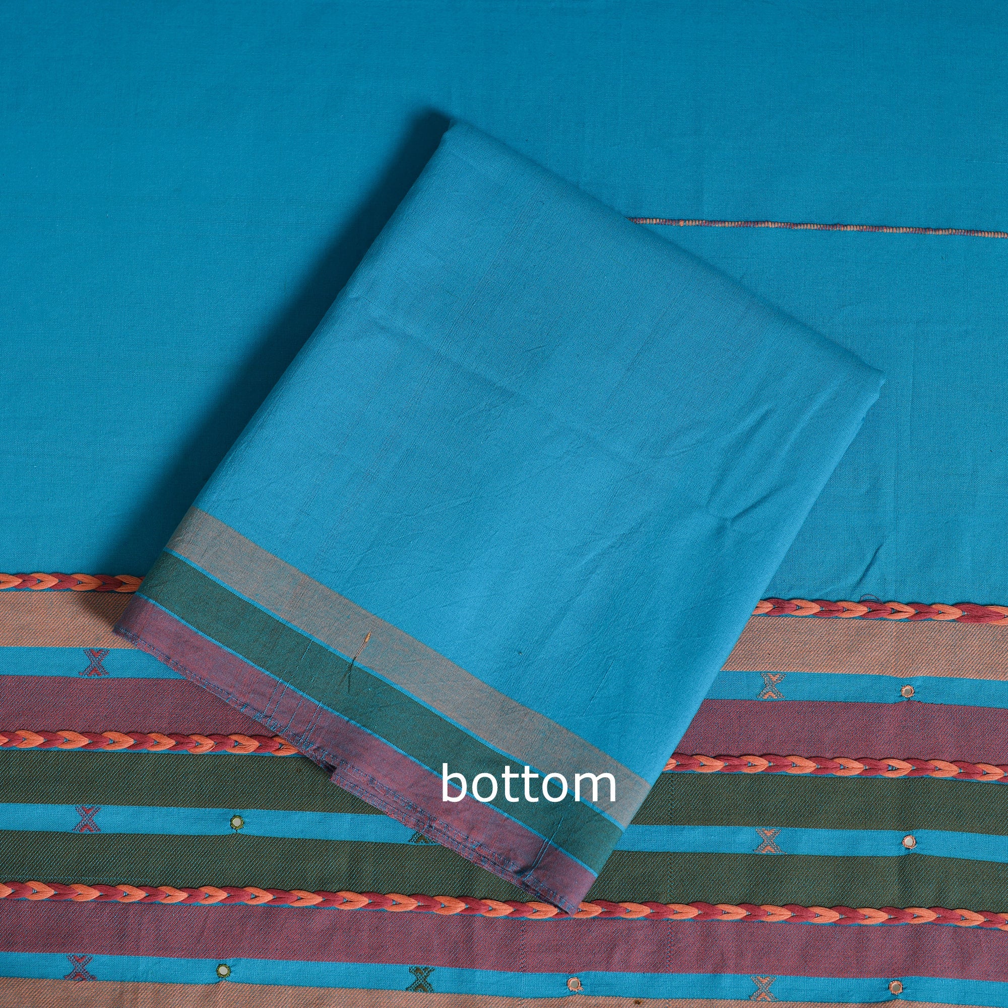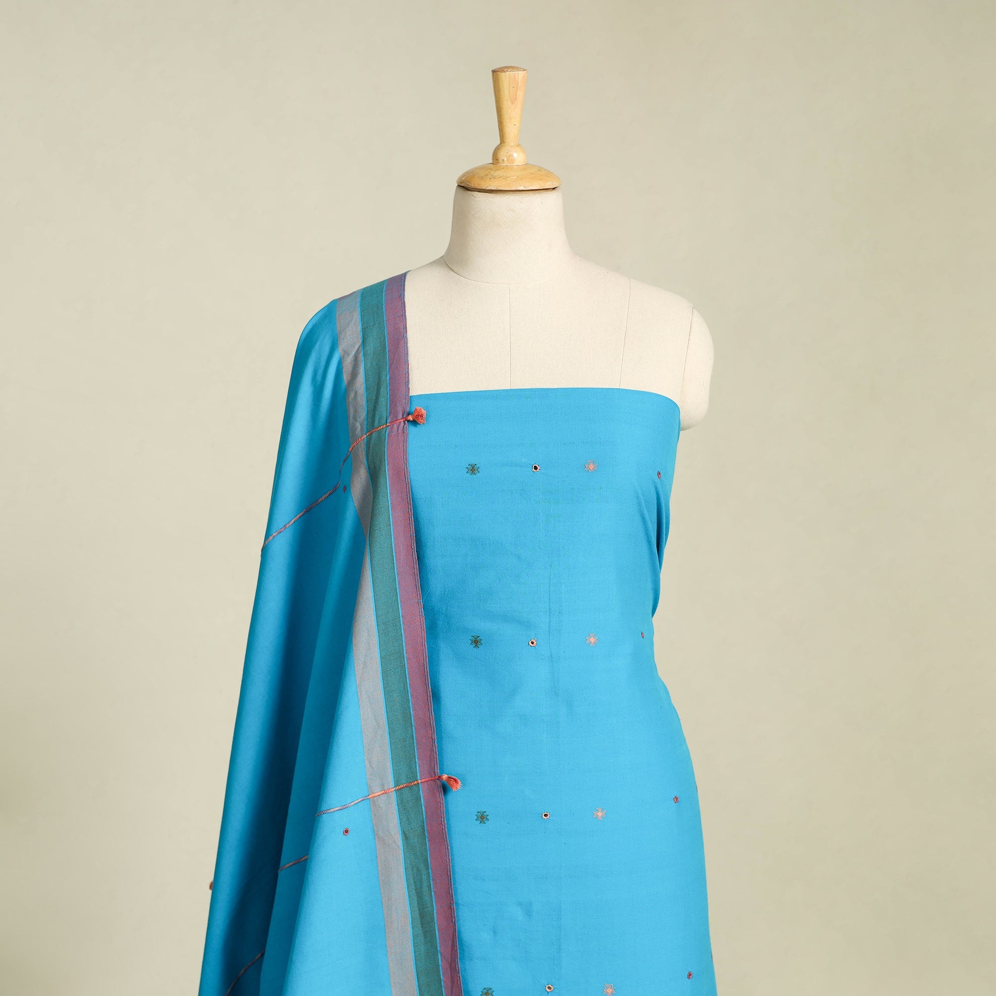 Elevate your style with a 3-piece blue kutch bhujodi weaving mirror work handloom fine cotton suit material set. Crafted with precision, this exquisite ensemble promises unparalleled elegance. The intricate mirror work and handloom finesse showcase traditional artistry. Immerse yourself in comfort as you weave cultural charm into every occasion with this versatile and luxurious suit material set.
