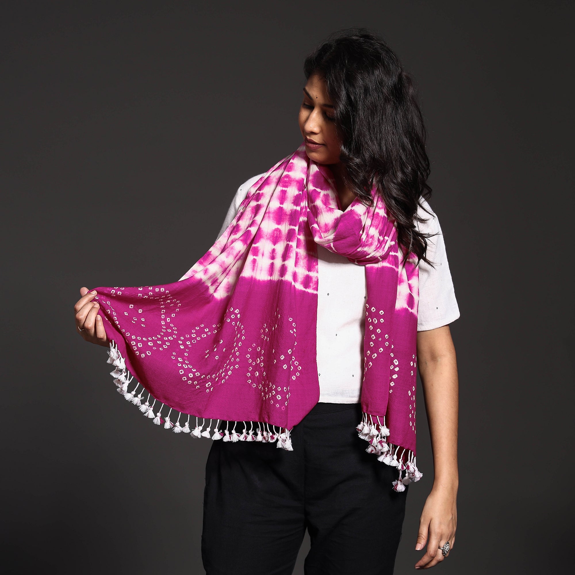 This exquisite handwoven pure merino wool stole features a majestic bandhani & shibori tie-dye pattern by craftsmen and women in the Kutch region of Gujarat. This stole is woven with traditional kutchi motifs. The soft, luxurious merino wool offers unparalleled comfort, making it perfect for any occasion. Elevate your style with this timeless accessory, adorned with traditional Kutchi motifs.