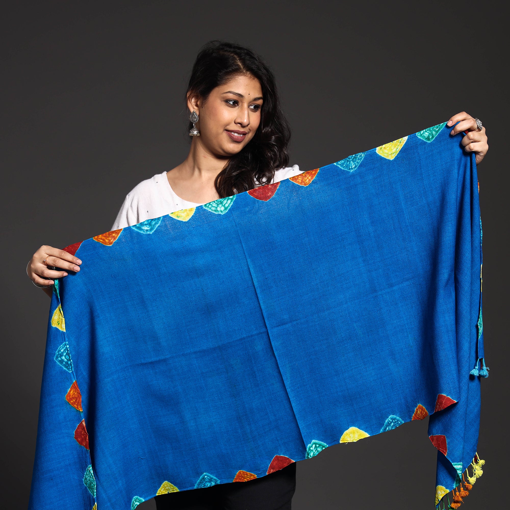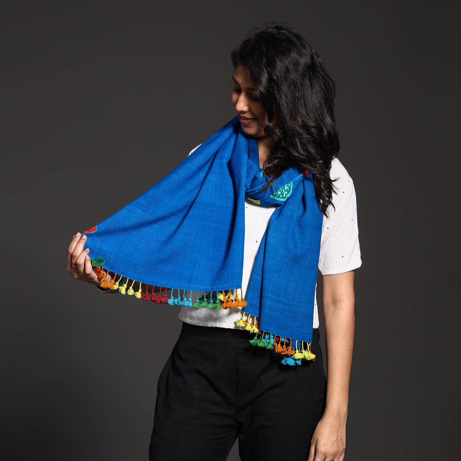 This exquisite handwoven merino wool stole features a majestic shibori tie-dye pattern by craftsmen and women in the Kutch region of Gujarat. This stole is woven with traditional Kutchi motifs. The soft, luxurious merino wool offers unparalleled comfort, making it perfect for any occasion. Elevate your style with this timeless accessory, adorned with traditional kutchi motifs.
