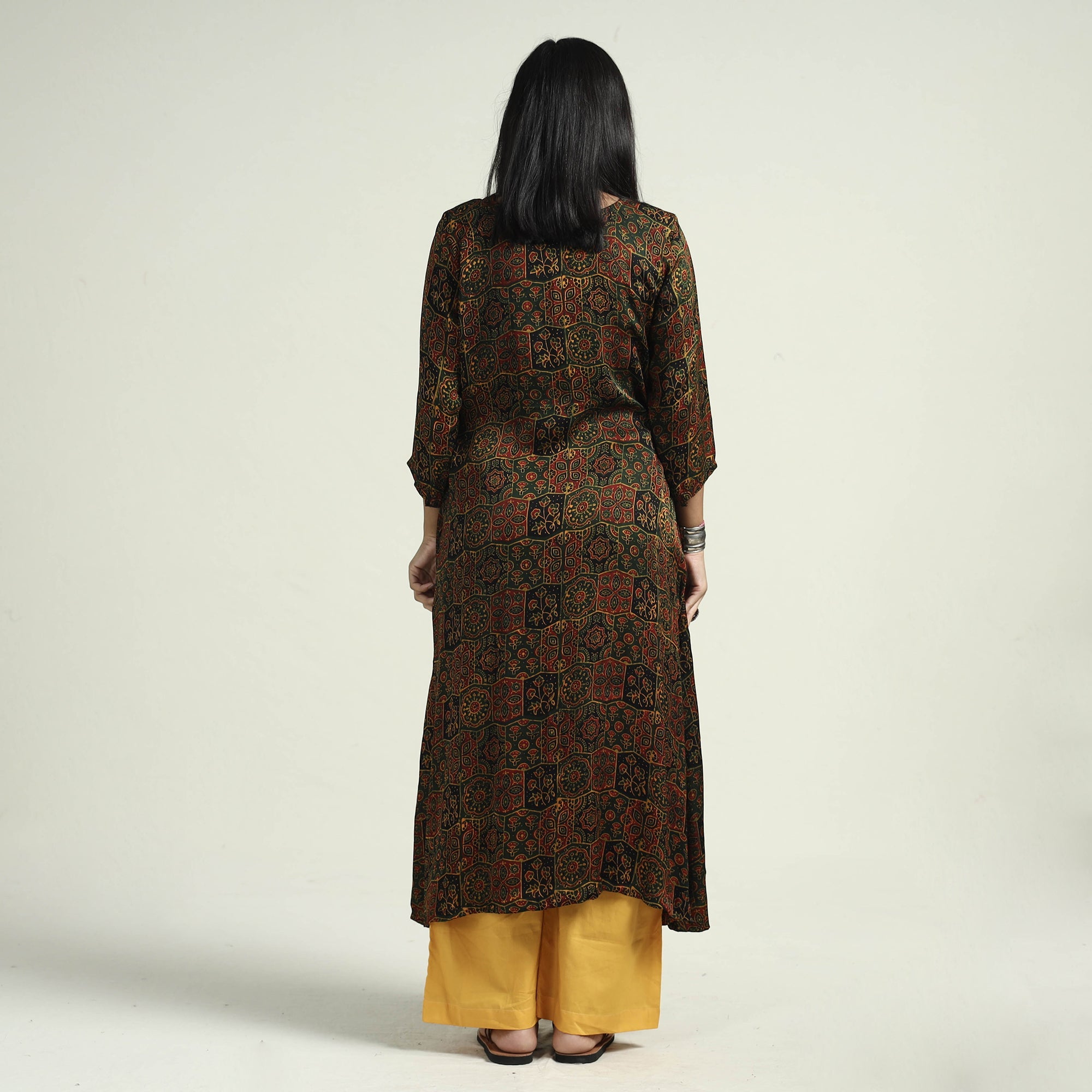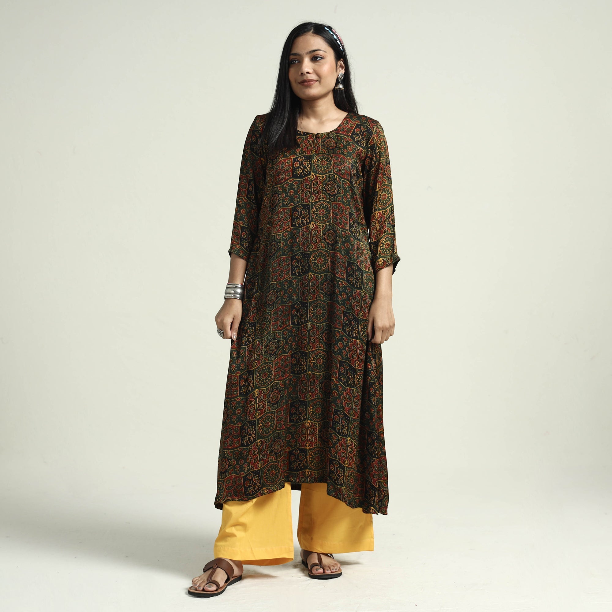 Look and feel beautiful in this uniquely designed ajrakh hand block printed modal silk long kurta with palazzo set. This suit set includes a modal silk kurta and plain cotton palazzo. The kurta also features a convenient one-side pocket, perfect for carrying small essentials, and the palazzo features an elasticized waist and two side pockets, adding functionality to this palazzo. Perfect for special occasions and celebrations, this elegant suit exudes traditional charm with its hand-block printed motifs.
