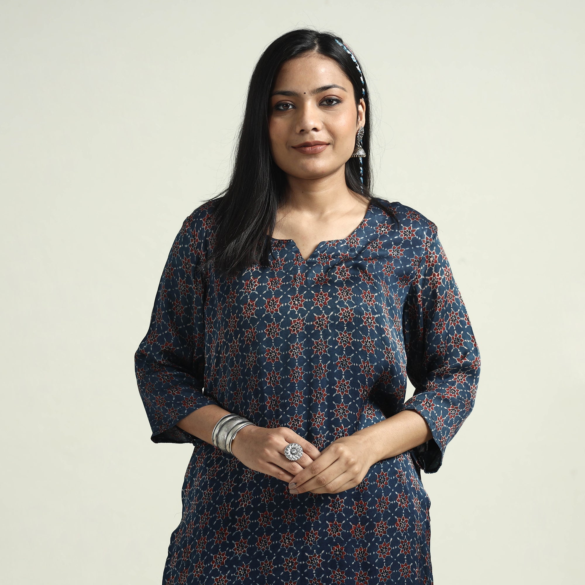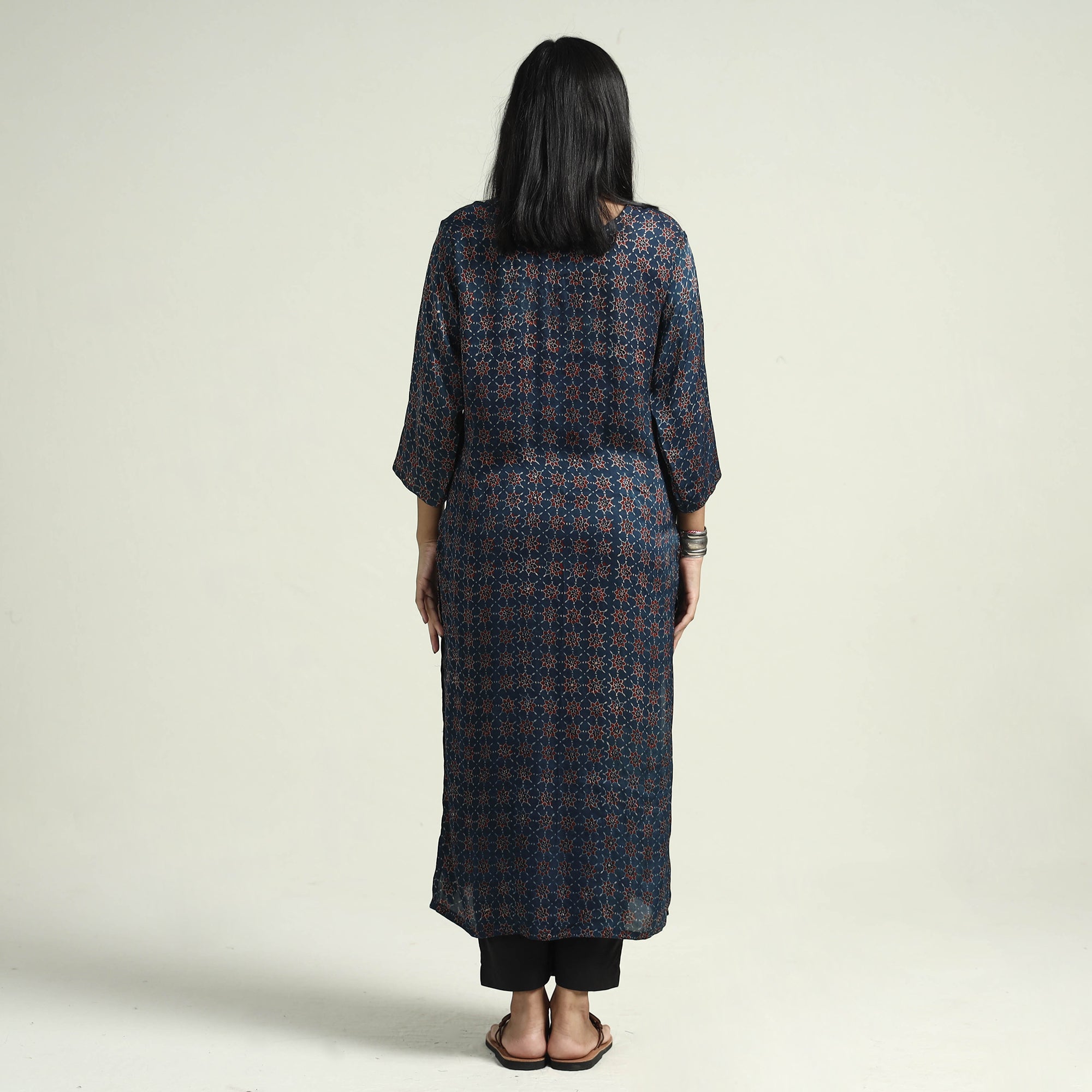 Look and feel beautiful in this uniquely designed ajrakh hand block printed modal silk long kurta with palazzo set. This suit set includes a modal silk kurta and plain cotton palazzo. The kurta also features a convenient one-side pocket, perfect for carrying small essentials, and the palazzo features an elasticized waist and two side pockets, adding functionality to this palazzo. Perfect for special occasions and celebrations, this elegant suit exudes traditional charm with its hand-block printed motifs.