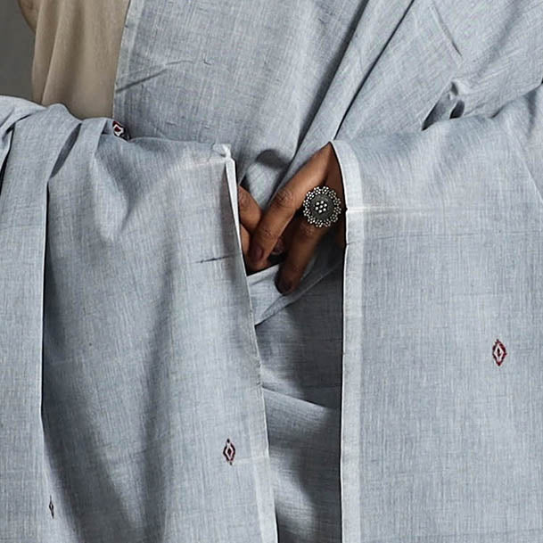 This exquisite Asssam weaving grey handloom cotton thread buti dupatta is crafted using cotton threads. The dupatta is lightweight, and breathable, making it perfect for all seasons. Skilled artisans in Assam meticulously hand-weave this dupatta using the traditional technique of handloom weaving. Each thread is carefully interlaced to create intricate buti patterns, showcasing the rich heritage of Assamese craftsmanship.