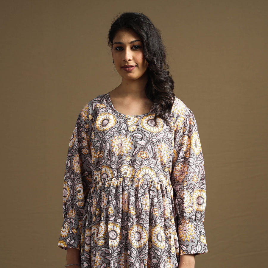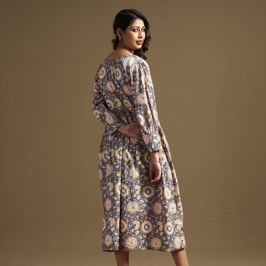 Grey - Sanganeri Block Printed Cotton Flared Dress