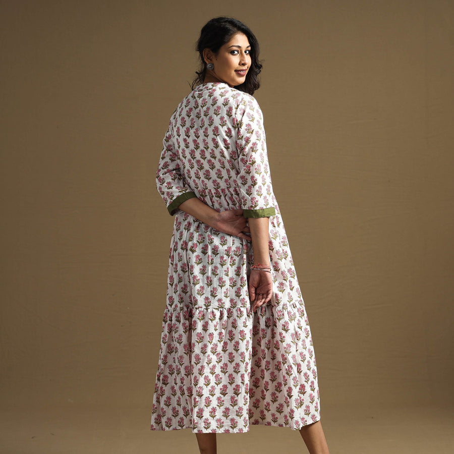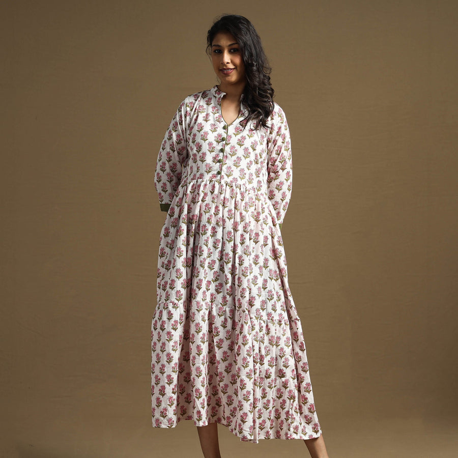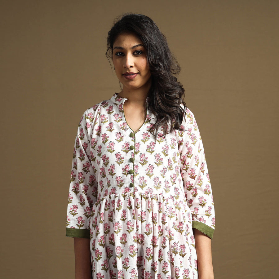 White with Pink Flower - Sanganeri Block Printed Cotton Flared Dress