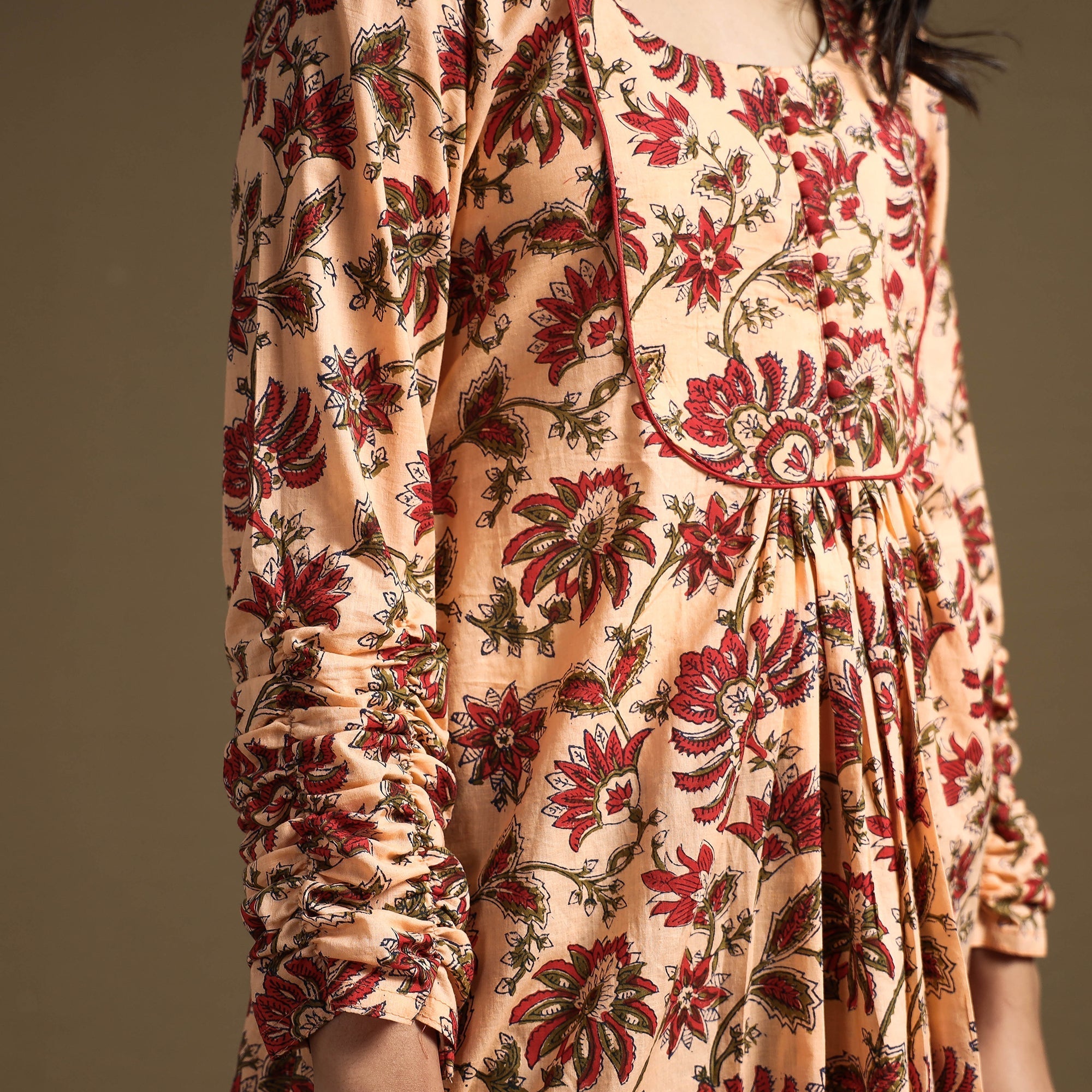 Peach - Sanganeri Block Printed Cotton Flared Dress