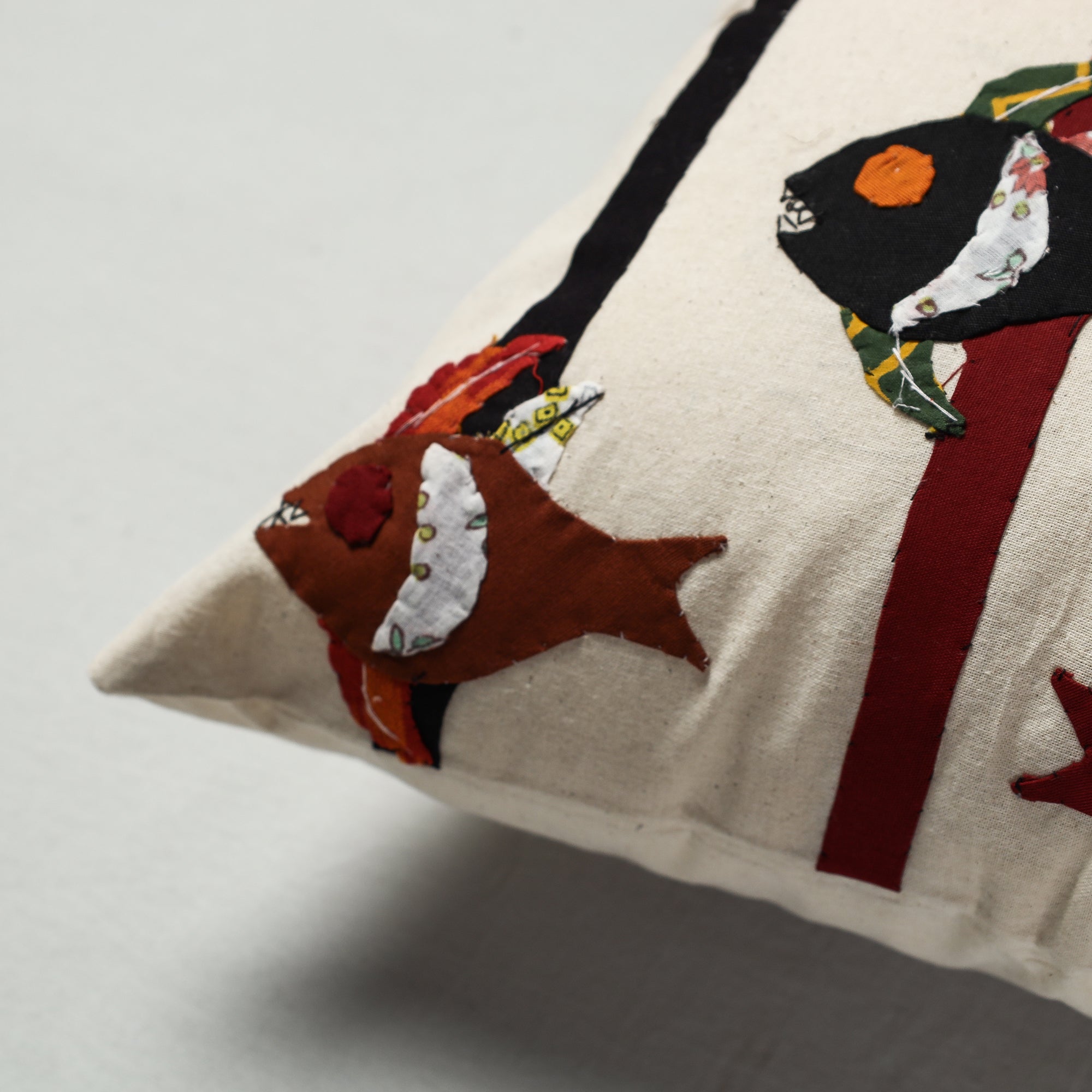 Tribal design hand stitched white pipli applique work cushion cover made from pure cotton fabrics, handcrafted by artisans of Pipili, the hub of traditional art & craft in Odisha. Applique work is a traditional patchwork that has a long history in Odisha. This applique work is normally dependent on some bright colours that is red, white, black, yellow, green and blue etc. The artisans skillfully stitch the traditional motifs like animals, birds and flowers on fabric. Modern applique art form mainly inspired by the religious in nature and it is closely connected with religious traditions.