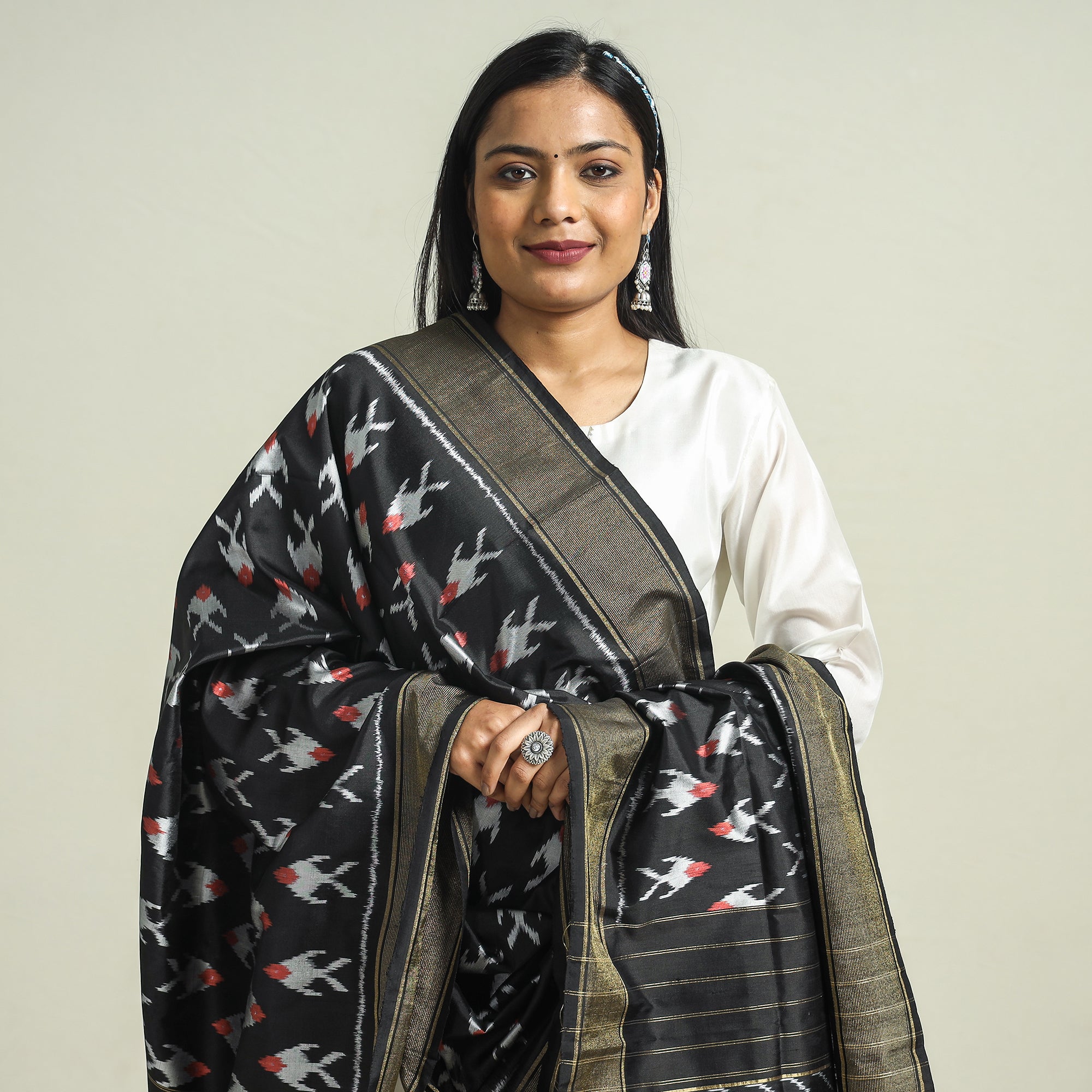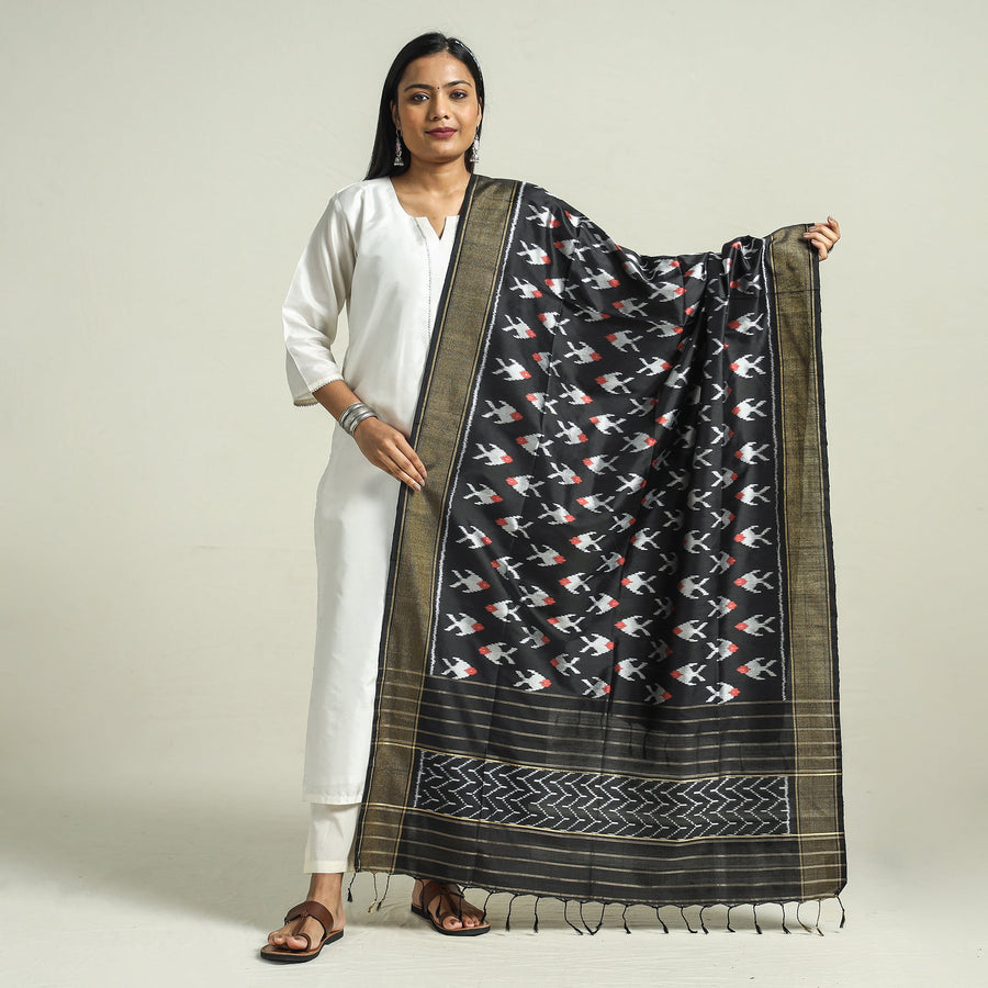 Elevate your style with our pochampally ikat pure mulberry silk handloom handwoven dupatta with Tassels. Ikat (Ikkat) is a dyeing technique used to pattern textiles that employs a resist dyeing process similar to tie-dye on either the warp or weft fibers prior to dyeing. Ikat has lovely patterns and are world famous for their extremely beautiful colors, texture and designs. Indian Ikat is always admired by the fashion designers around the world. Mulberry silk known for its shine and softness. It is one of the most renowned and popular forms of silk. Adorned with chic tassels, it effortlessly enhances both casual and formal ensembles, adding a touch of cultural charm and elegance to your wardrobe.