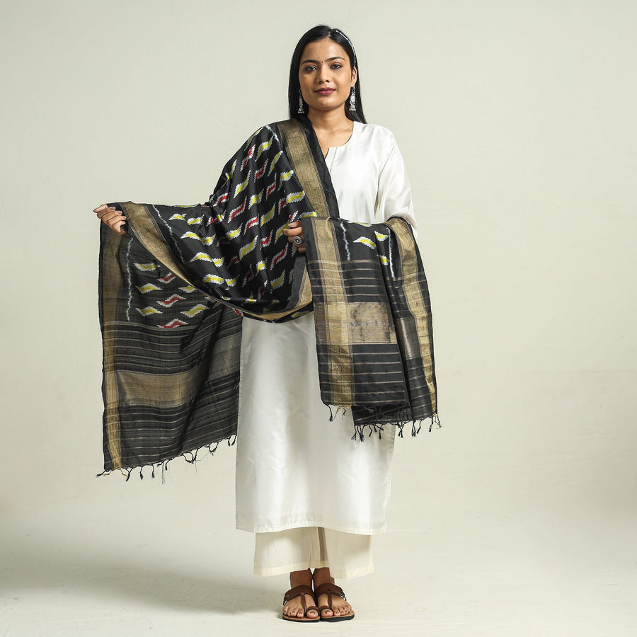 Elevate your style with our pochampally ikat pure mulberry silk handloom handwoven dupatta with Tassels. Ikat (Ikkat) is a dyeing technique used to pattern textiles that employs a resist dyeing process similar to tie-dye on either the warp or weft fibers prior to dyeing. Ikat has lovely patterns and are world famous for their extremely beautiful colors, texture and designs. Indian Ikat is always admired by the fashion designers around the world. Mulberry silk known for its shine and softness. It is one of the most renowned and popular forms of silk. Adorned with chic tassels, it effortlessly enhances both casual and formal ensembles, adding a touch of cultural charm and elegance to your wardrobe.