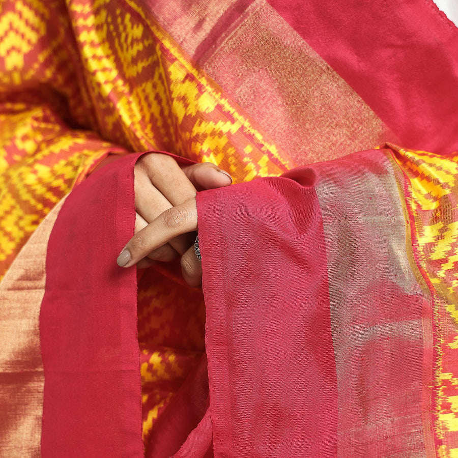 {"id":7694820769987,"title":"Yellow - Handwoven Pochampally Ikat Pure Mulberry Silk Dupatta with Tassels","handle":"2023-1134-2-30-handwoven-pochampally-ikat-pure-mulberry-silk-dupatta-with-tassels","description":"\u003ctable width=\"100%\" class=\"gmail-mce-item-table\"\u003e\n\u003ctbody\u003e\n\u003ctr\u003e\n\u003ctd\u003e\u003cspan\u003eSize\u003c\/span\u003e\u003c\/td\u003e\n\u003ctd\u003e\n\u003cspan\u003eLength - 226 cm, Width - 89 cm\u003c\/span\u003e\u003cspan\u003e.\u003c\/span\u003e\n\u003c\/td\u003e\n\u003c\/tr\u003e\n\u003ctr\u003e\n\u003ctd\u003e\u003cspan\u003eWeight\u003c\/span\u003e\u003c\/td\u003e\n\u003ctd\u003e\u003cspan\u003e185 grams (approximately). Soft texture \u0026amp; light weight\u003c\/span\u003e\u003c\/td\u003e\n\u003c\/tr\u003e\n\u003ctr\u003e\n\u003ctd\u003e\u003cspan\u003eMaterial\u003c\/span\u003e\u003c\/td\u003e\n\u003ctd\u003eElevate your style with our pochampally ikat pure mulberry silk handloom handwoven dupatta with Tassels. Ikat (Ikkat) is a dyeing technique used to pattern textiles that employs a resist dyeing process similar to tie-dye on either the warp or weft fibers prior to dyeing. Ikat has lovely patterns and are world famous for their extremely beautiful colors, texture and designs. Indian Ikat is always admired by the fashion designers around the world. Mulberry silk known for its shine and softness. It is one of the most renowned and popular forms of silk. Adorned with chic tassels, it effortlessly enhances both casual and formal ensembles, adding a touch of cultural charm and elegance to your wardrobe.\u003cbr\u003e\n\u003c\/td\u003e\n\u003c\/tr\u003e\n\u003ctr\u003e\n\u003ctd\u003e\u003cspan\u003eCare\u003c\/span\u003e\u003c\/td\u003e\n\u003ctd\u003e\u003cspan\u003eDry clean only.\u003c\/span\u003e\u003c\/td\u003e\n\u003c\/tr\u003e\n\u003ctr\u003e\n\u003ctd\u003e\u003cspan\u003eColour\u003c\/span\u003e\u003c\/td\u003e\n\u003ctd\u003eSlight difference in colour from the visible product image is possible.\u003cspan\u003e \u003c\/span\u003e\u003ca href=\"\/pages\/photos\" data-mce-href=\"http:\/\/www.itokri.com\/pages\/photos\" target=\"_blank\" title=\"Authentic handcrafted products | itokri’s visual and quality promise\" aria-label=\"Authentic handcrafted products | itokri’s visual and quality promise\"\u003eRead more\u003c\/a\u003e.\u003c\/td\u003e\n\u003c\/tr\u003e\n\u003c\/tbody\u003e\n\u003c\/table\u003e","published_at":"2023-12-22T16:11:49+05:30","created_at":"2023-12-22T14:51:58+05:30","vendor":"IKAT WEAVES BY EDEM CHANDANA","type":"dupattas","tags":["dupattas","ikat weaves by edem chandana","material-mulberry silk","meta-filter-craft process-pochampally ikat weaving","primarycraft_pochampally-ikat-weaving","yellow"],"price":750000,"price_min":750000,"price_max":750000,"available":true,"price_varies":false,"compare_at_price":null,"compare_at_price_min":0,"compare_at_price_max":0,"compare_at_price_varies":false,"variants":[{"id":42746001424579,"title":"Default Title","option1":"Default Title","option2":null,"option3":null,"sku":"SVF\/51\/B\/20","requires_shipping":true,"taxable":true,"featured_image":null,"available":true,"name":"Yellow - Handwoven Pochampally Ikat Pure Mulberry Silk Dupatta with Tassels","public_title":null,"options":["Default Title"],"price":750000,"weight":500,"compare_at_price":null,"inventory_quantity":1,"inventory_management":"shopify","inventory_policy":"deny","barcode":null,"requires_selling_plan":false,"selling_plan_allocations":[],"quantity_rule":{"min":1,"max":null,"increment":1}}],"images":["\/\/itokri.com\/cdn\/shop\/files\/yellow-handwoven-pochampally-ikat-pure-mulberry-silk-dupatta-tassels-758.jpg?v=1764812772","\/\/itokri.com\/cdn\/shop\/files\/yellow-handwoven-pochampally-ikat-pure-mulberry-silk-dupatta-tassels-477.jpg?v=1764812775","\/\/itokri.com\/cdn\/shop\/files\/yellow-handwoven-pochampally-ikat-pure-mulberry-silk-dupatta-tassels-282.jpg?v=1764812778","\/\/itokri.com\/cdn\/shop\/files\/yellow-handwoven-pochampally-ikat-pure-mulberry-silk-dupatta-tassels-217.jpg?v=1764812781","\/\/itokri.com\/cdn\/shop\/files\/yellow-handwoven-pochampally-ikat-pure-mulberry-silk-dupatta-tassels-158.jpg?v=1764812784","\/\/itokri.com\/cdn\/shop\/files\/yellow-handwoven-pochampally-ikat-pure-mulberry-silk-dupatta-tassels-692.jpg?v=1764812787"],"featured_image":"\/\/itokri.com\/cdn\/shop\/files\/yellow-handwoven-pochampally-ikat-pure-mulberry-silk-dupatta-tassels-758.jpg?v=1764812772","options":["Title"],"media":[{"alt":"Buy Handwoven Pochampally Ikat Pure Mulberry Silk Dupatta with Tassels Online at iTokri.com","id":36829627089091,"position":1,"preview_image":{"aspect_ratio":1.0,"height":2000,"width":2000,"src":"\/\/itokri.com\/cdn\/shop\/files\/yellow-handwoven-pochampally-ikat-pure-mulberry-silk-dupatta-tassels-758.jpg?v=1764812772"},"aspect_ratio":1.0,"height":2000,"media_type":"image","src":"\/\/itokri.com\/cdn\/shop\/files\/yellow-handwoven-pochampally-ikat-pure-mulberry-silk-dupatta-tassels-758.jpg?v=1764812772","width":2000},{"alt":"Buy Handwoven Pochampally Ikat Pure Mulberry Silk Dupatta with Tassels Online at iTokri.com","id":36829627121859,"position":2,"preview_image":{"aspect_ratio":1.0,"height":2000,"width":2000,"src":"\/\/itokri.com\/cdn\/shop\/files\/yellow-handwoven-pochampally-ikat-pure-mulberry-silk-dupatta-tassels-477.jpg?v=1764812775"},"aspect_ratio":1.0,"height":2000,"media_type":"image","src":"\/\/itokri.com\/cdn\/shop\/files\/yellow-handwoven-pochampally-ikat-pure-mulberry-silk-dupatta-tassels-477.jpg?v=1764812775","width":2000},{"alt":"Buy Handwoven Pochampally Ikat Pure Mulberry Silk Dupatta with Tassels Online at iTokri.com","id":36829627318467,"position":3,"preview_image":{"aspect_ratio":1.0,"height":2000,"width":2000,"src":"\/\/itokri.com\/cdn\/shop\/files\/yellow-handwoven-pochampally-ikat-pure-mulberry-silk-dupatta-tassels-282.jpg?v=1764812778"},"aspect_ratio":1.0,"height":2000,"media_type":"image","src":"\/\/itokri.com\/cdn\/shop\/files\/yellow-handwoven-pochampally-ikat-pure-m