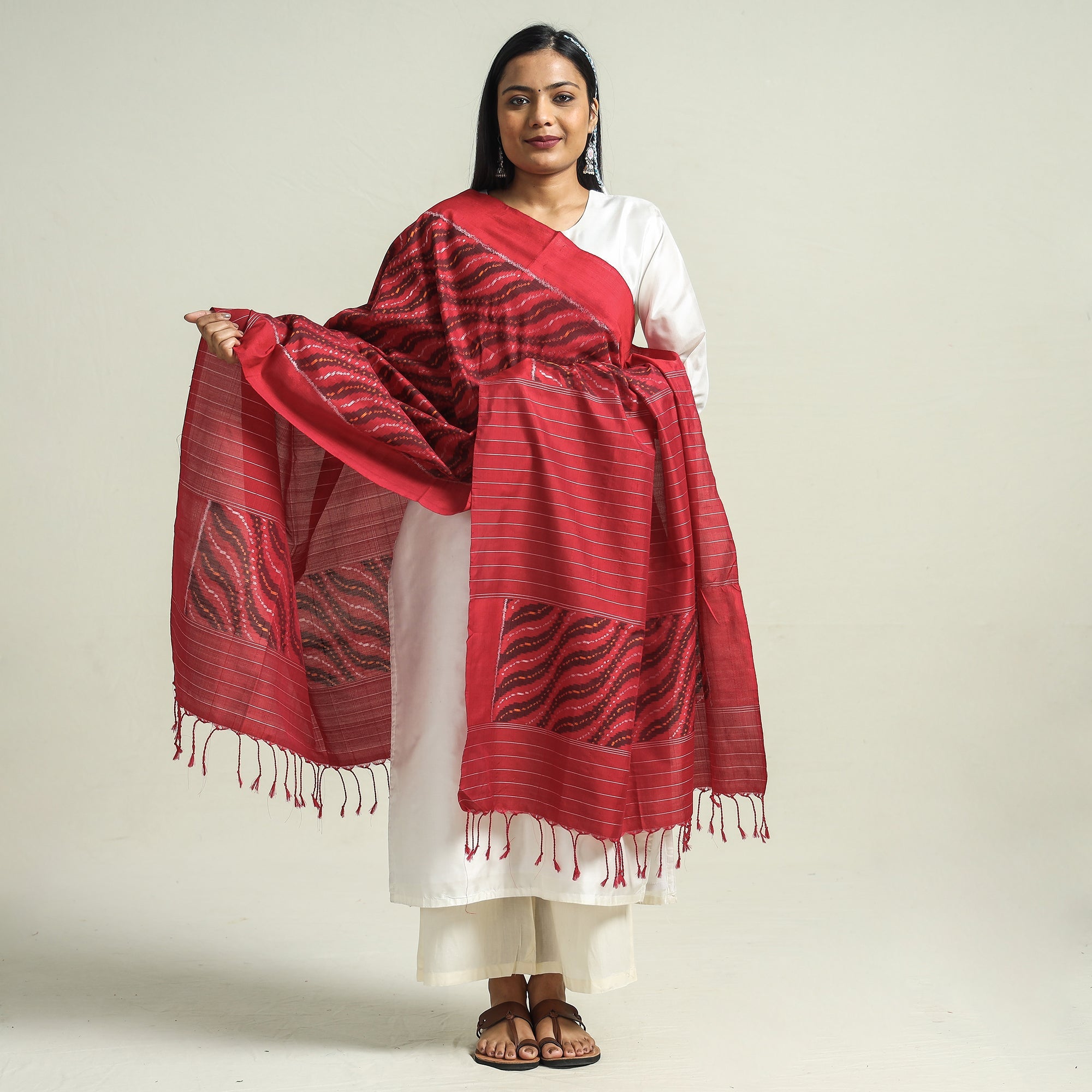 Elevate your style with our pochampally ikat pure mulberry silk handloom handwoven dupatta with Tassels. Ikat (Ikkat) is a dyeing technique used to pattern textiles that employs a resist dyeing process similar to tie-dye on either the warp or weft fibers prior to dyeing. Ikat has lovely patterns and are world famous for their extremely beautiful colors, texture and designs. Indian Ikat is always admired by the fashion designers around the world. Mulberry silk known for its shine and softness. It is one of the most renowned and popular forms of silk. Adorned with chic tassels, it effortlessly enhances both casual and formal ensembles, adding a touch of cultural charm and elegance to your wardrobe.