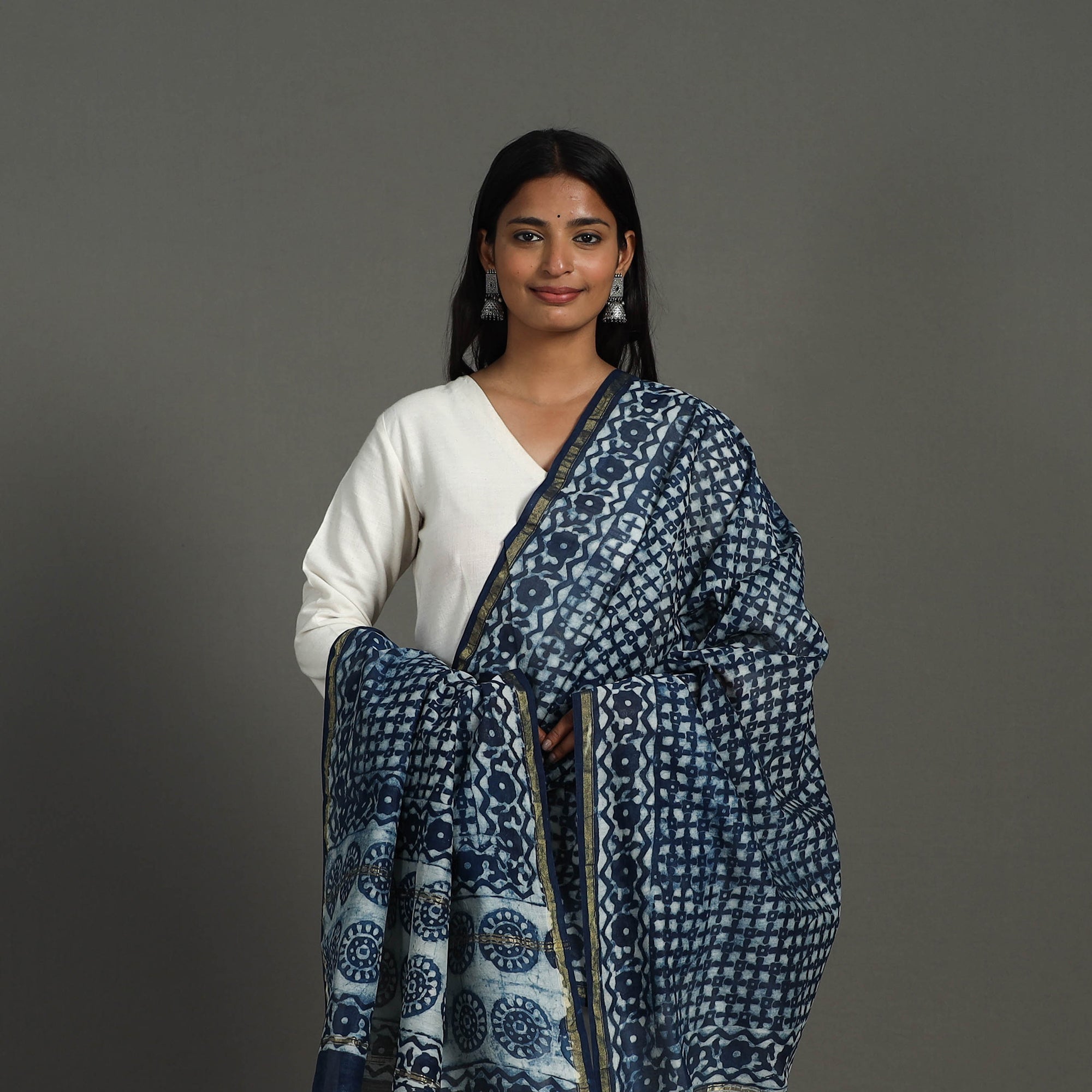 Experience the traditional artistry of Rajasthan with our indigo bagru dabu hand block printed chanderi silk-cotton dupatta. This exquisite dupatta is made using natural dyes through the traditional mud resist process using hand-carved wooden blocks practiced in Bagru, Rajasthan. This versatile dupatta complements any outfit, making it a perfect accessory for casual outings or special events, effortlessly combining traditional craftsmanship with contemporary elegance.