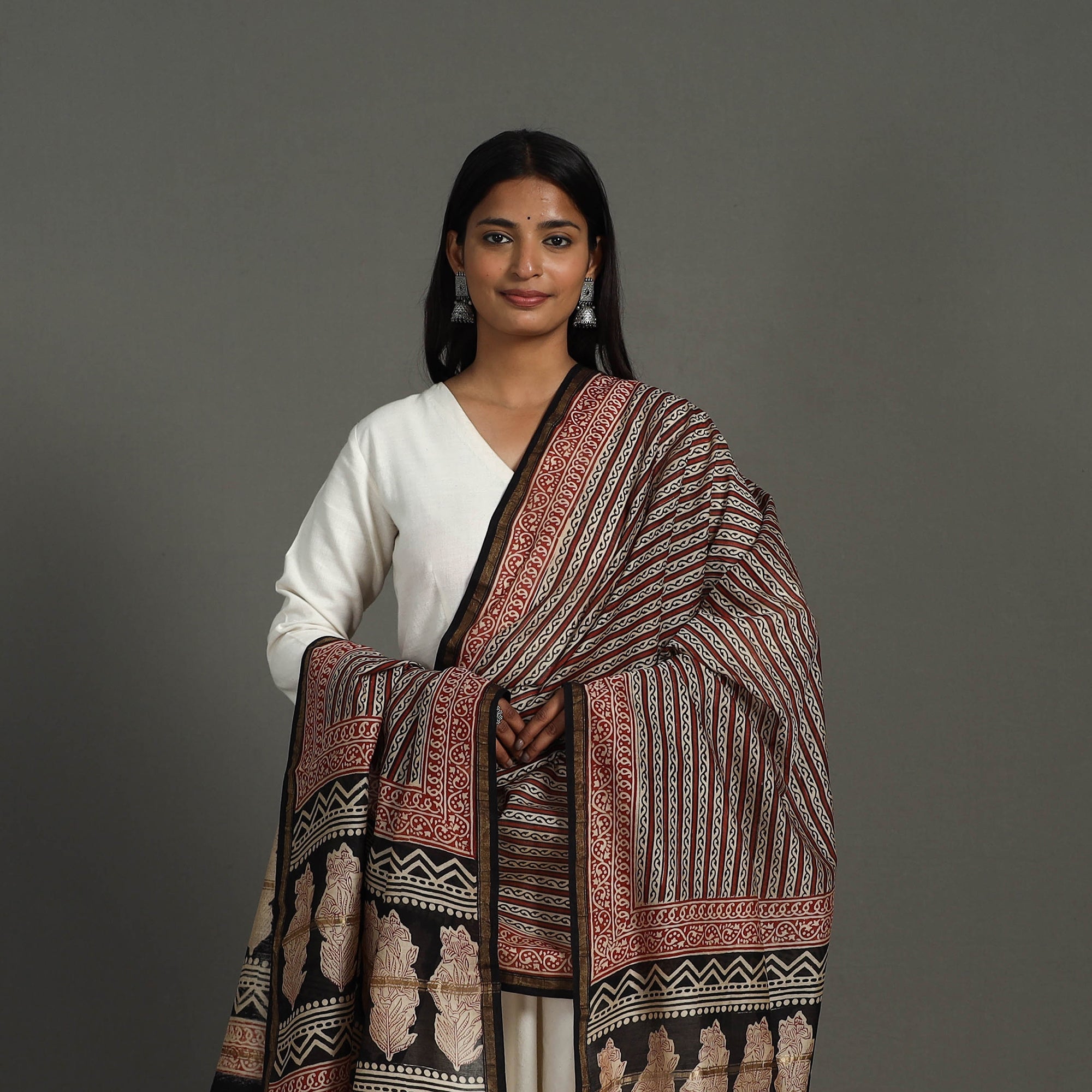 Experience the traditional artistry of Rajasthan with our brown bagru hand block printed chanderi silk-cotton dupatta with zari border. This exquisite dupatta is made using natural dyes through the traditional mud resist process using hand-carved wooden blocks practiced in Bagru, Rajasthan. This versatile dupatta complements any outfit, making it a perfect accessory for casual outings or special events, effortlessly combining traditional craftsmanship with contemporary elegance.